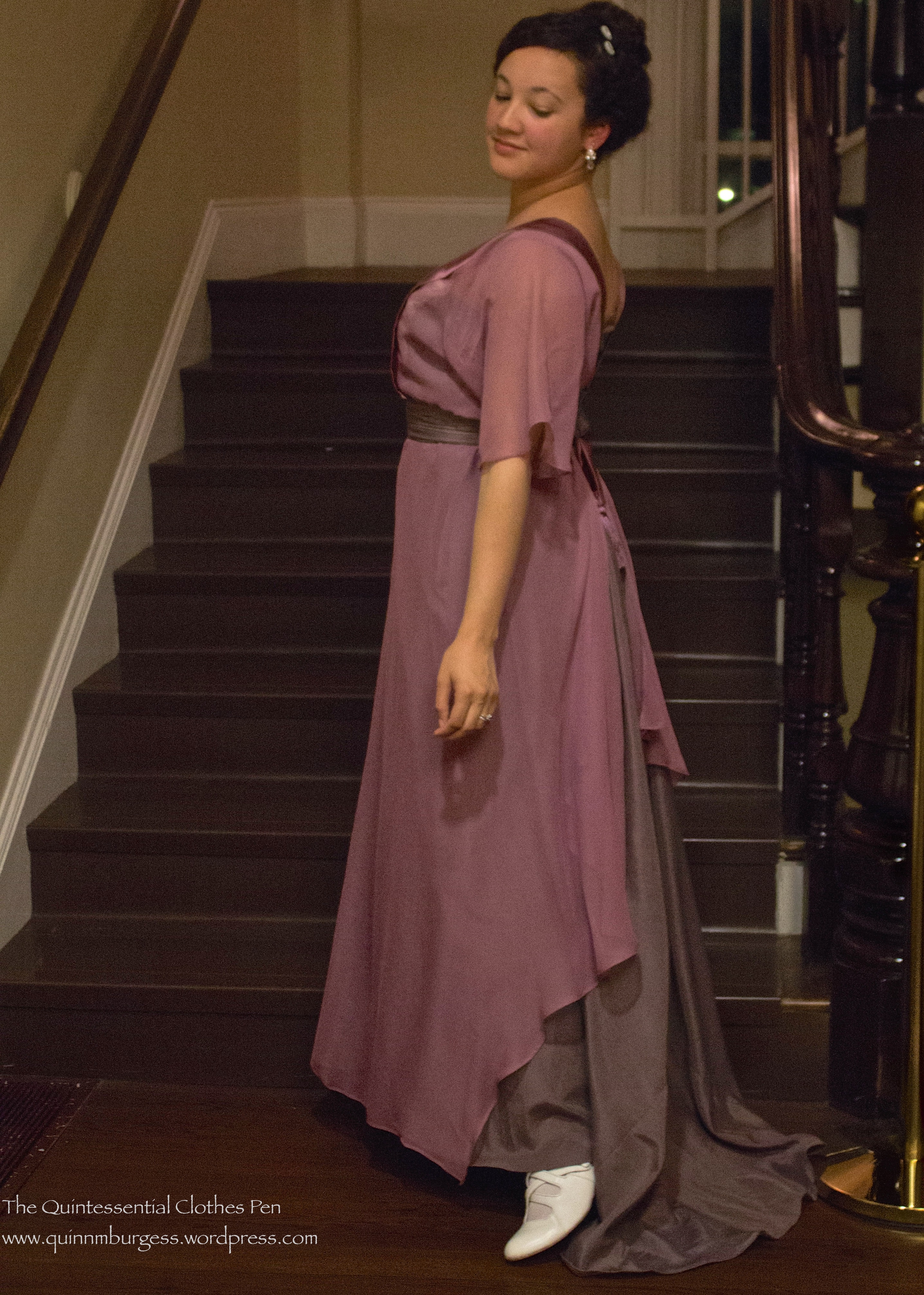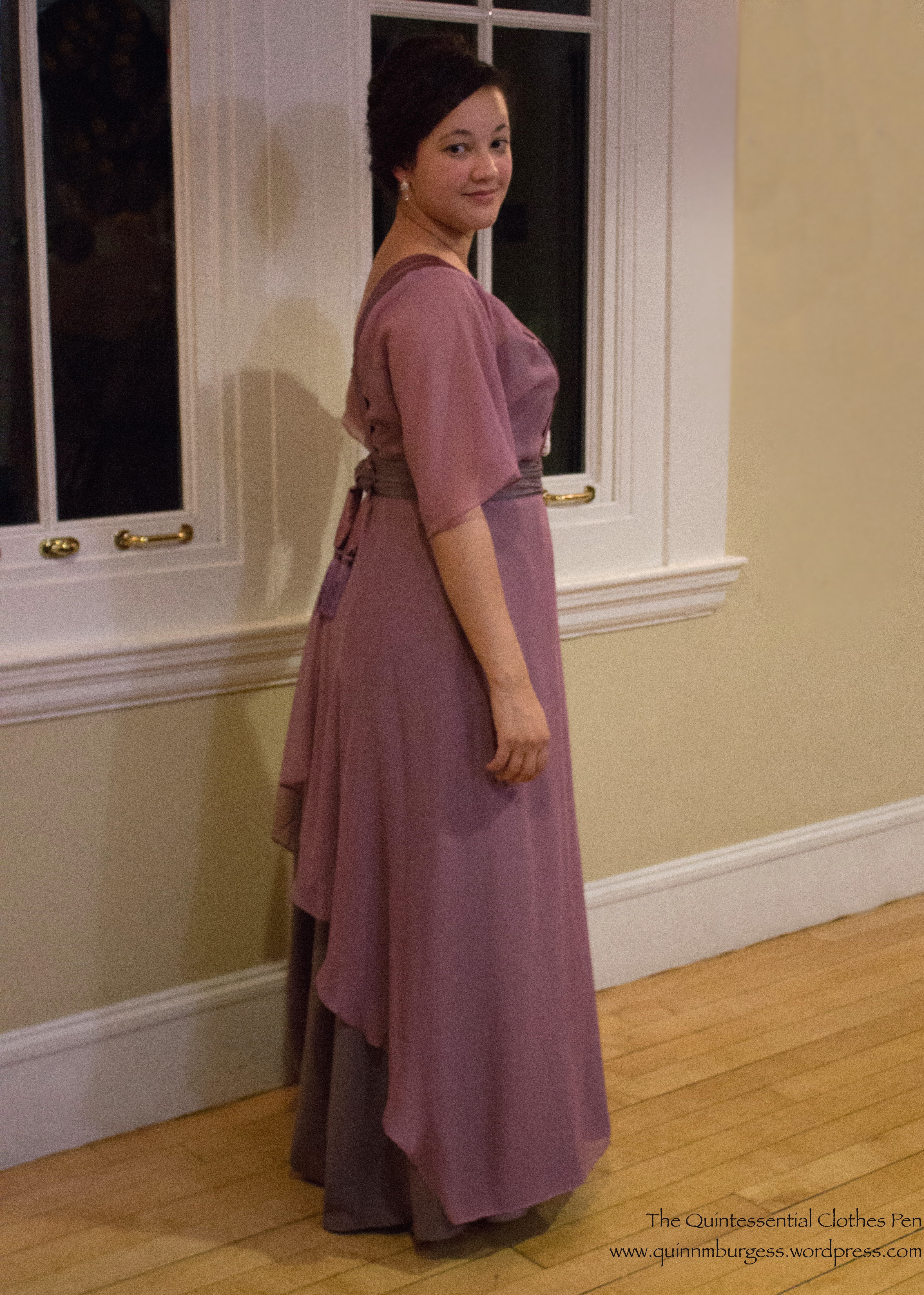 Overall, I’m super pleased with this dress. It’s very comfortable, has lots of fabric in the skirt so is easy to dance in, and is a nice transitional style between the full skirts and pigeon breasts of the years around 1908 and the much slimmer, longer lines of the years around 1912. Plus, it has a train!
