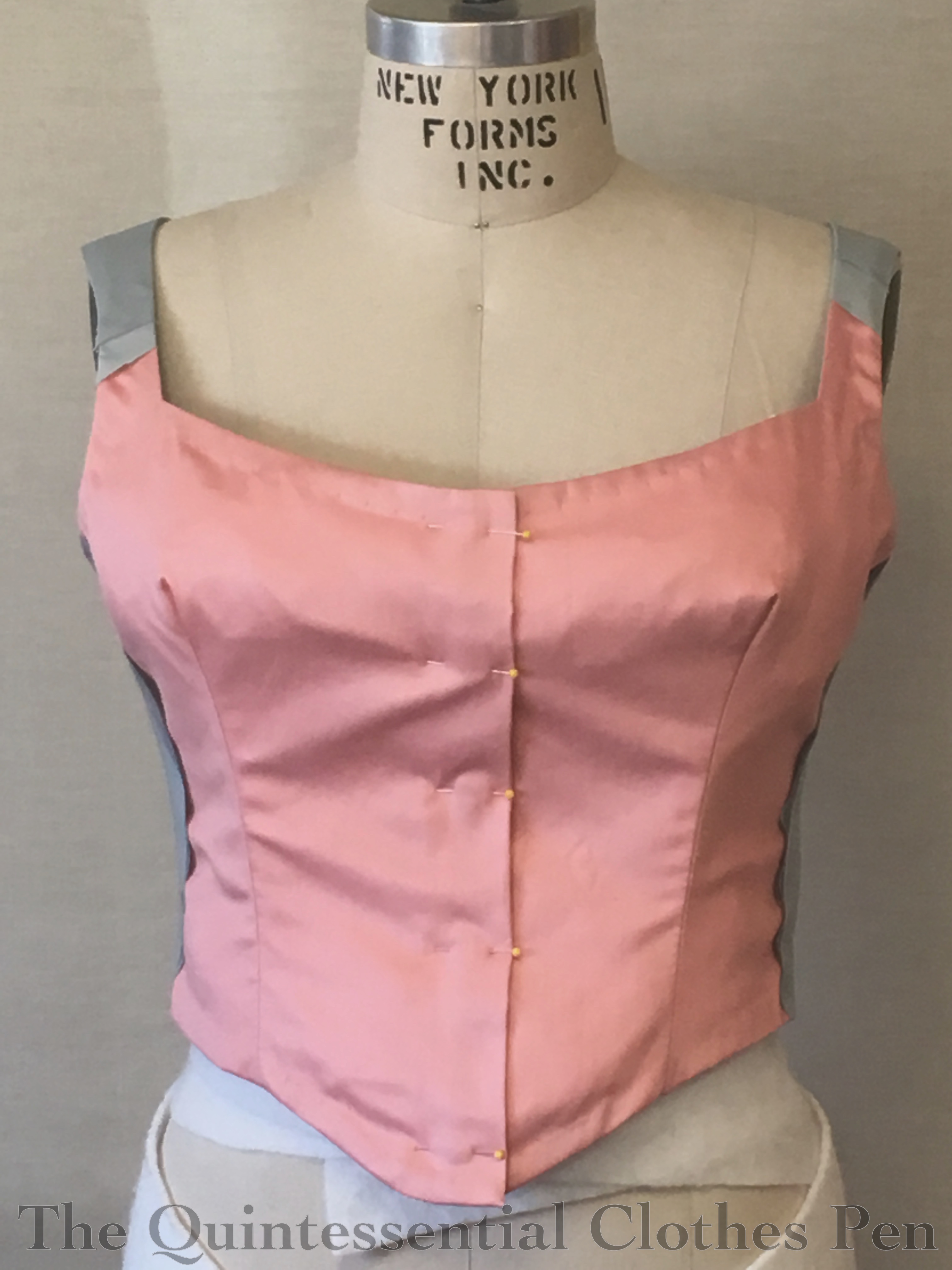 And here’s what the bodice looks like with center fronts together. The bit with the tulle actually hooks over the other side (but pictured this way, you can see the closures). After that, the front panel hooks across the front and is securely hooked at the side seam, effectively covering my pink lining.