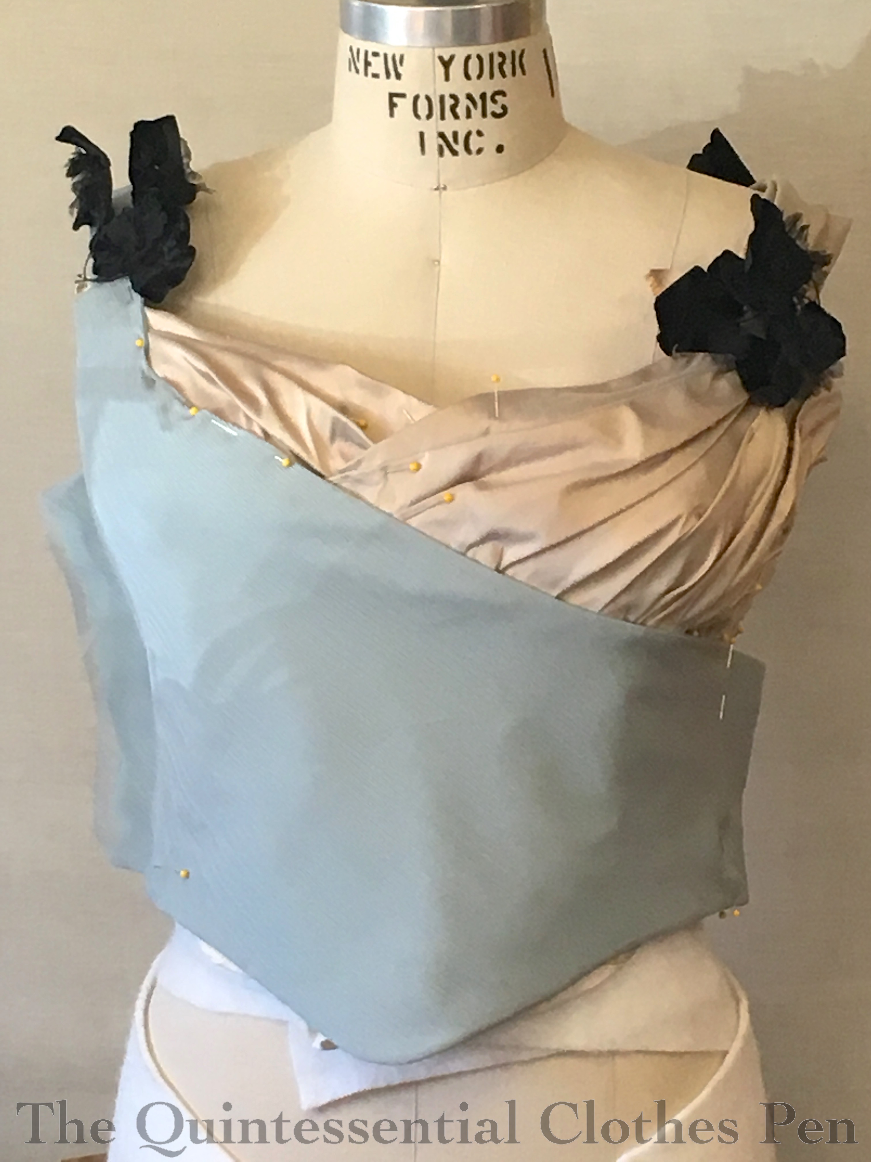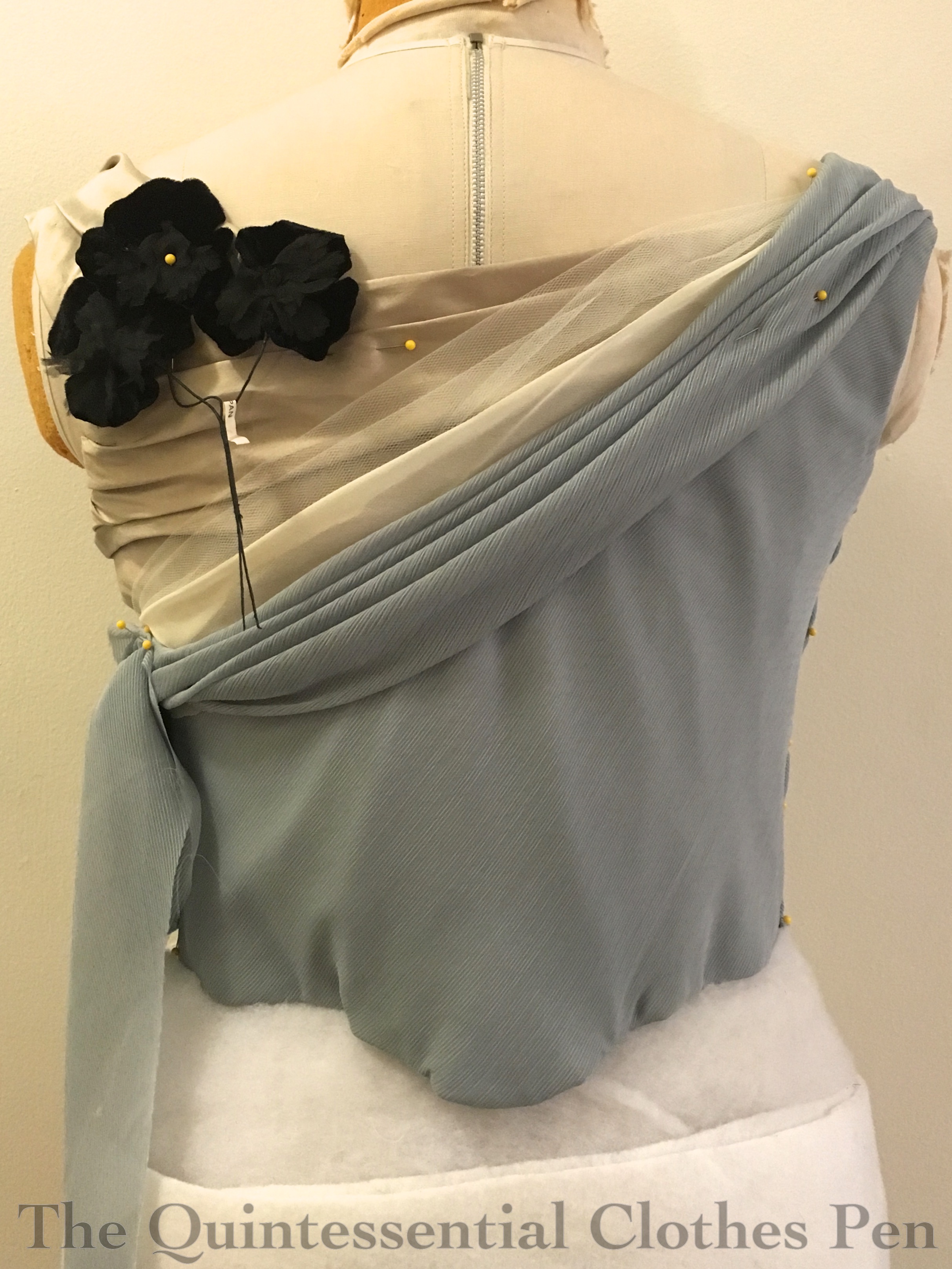 At this stage, I’ve added gauze and tulle to the front and am playing with the chiffon edging. The flowers are tucked into place to see the effect. I’ve also sewn down the proper right (left in the picture) side. The proper left (right in the picture) side is pinned and tucked, waiting for a final fitting before finishing and adding closures.