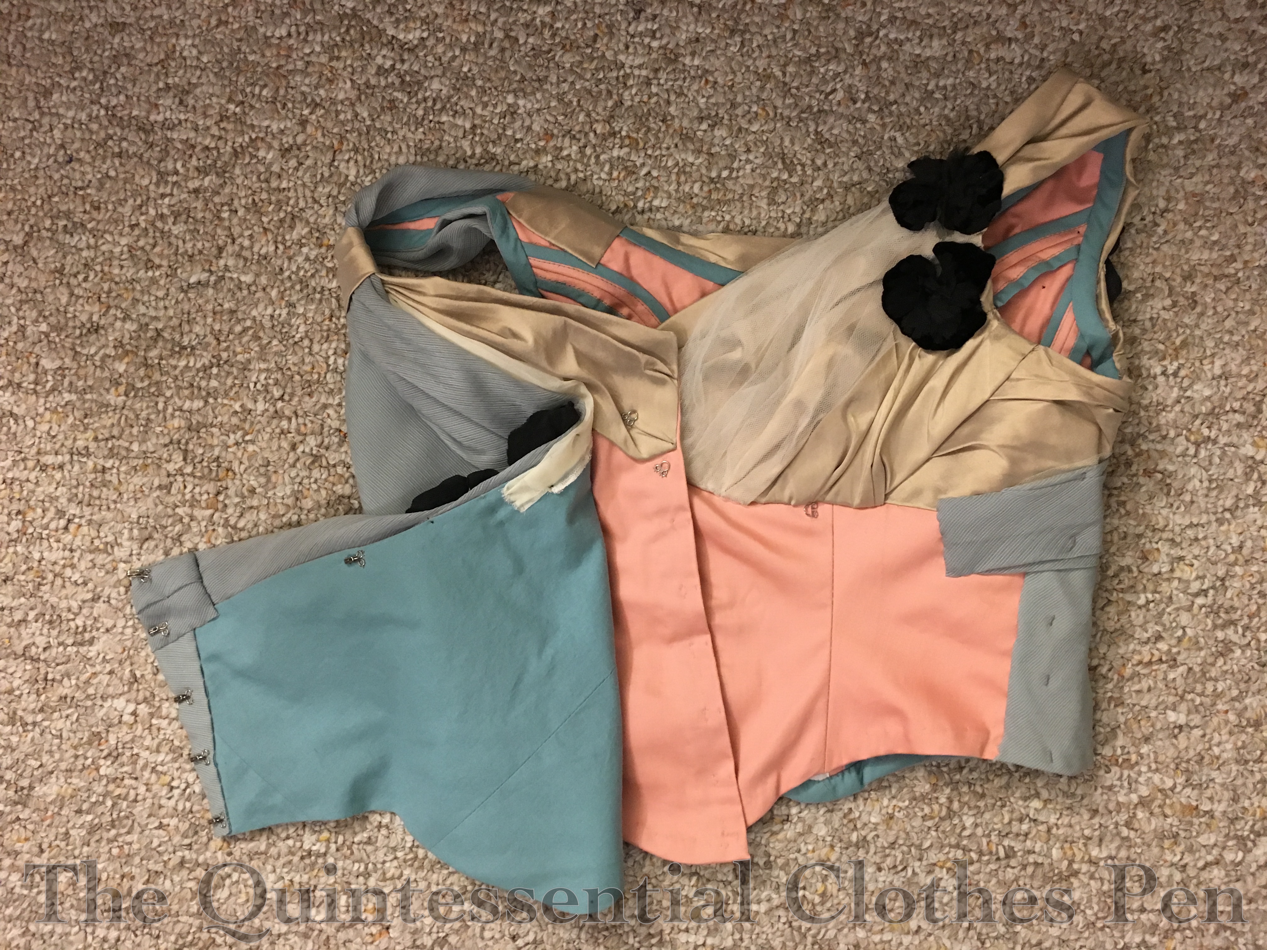 Here is the bodice in the middle stages on construction. You’d never guess from the exterior, but the bodice is flat lined with pink! This is not a standard lining color, but I had it on hand, it is the right weight (with a glazed finish, which is standard), and it amused me. By this point, I’d finished my edges, adding boning, nicely finished my interior seam allowances, and covered the back with elusive blue lining and chiffon cut on the bias.