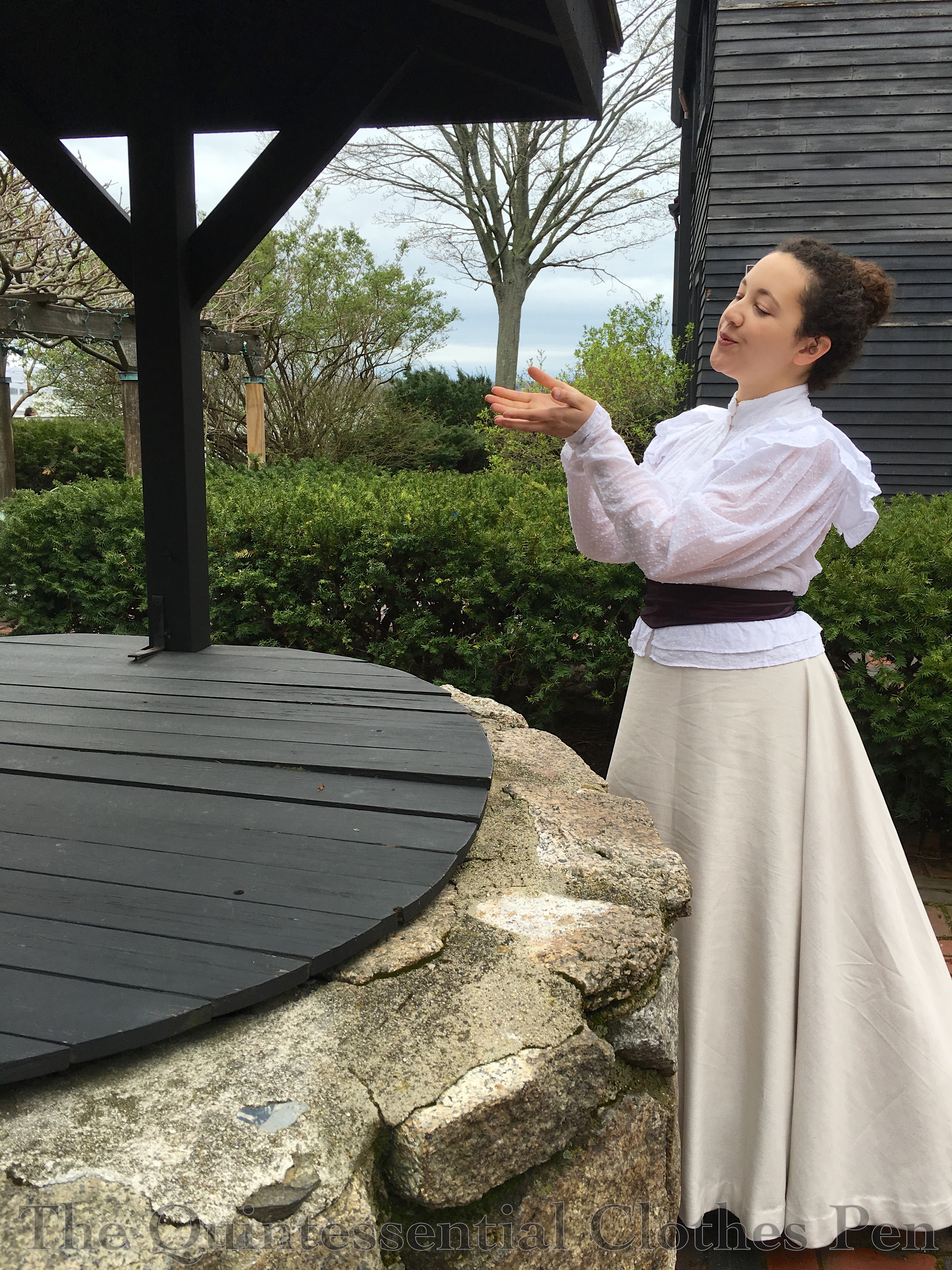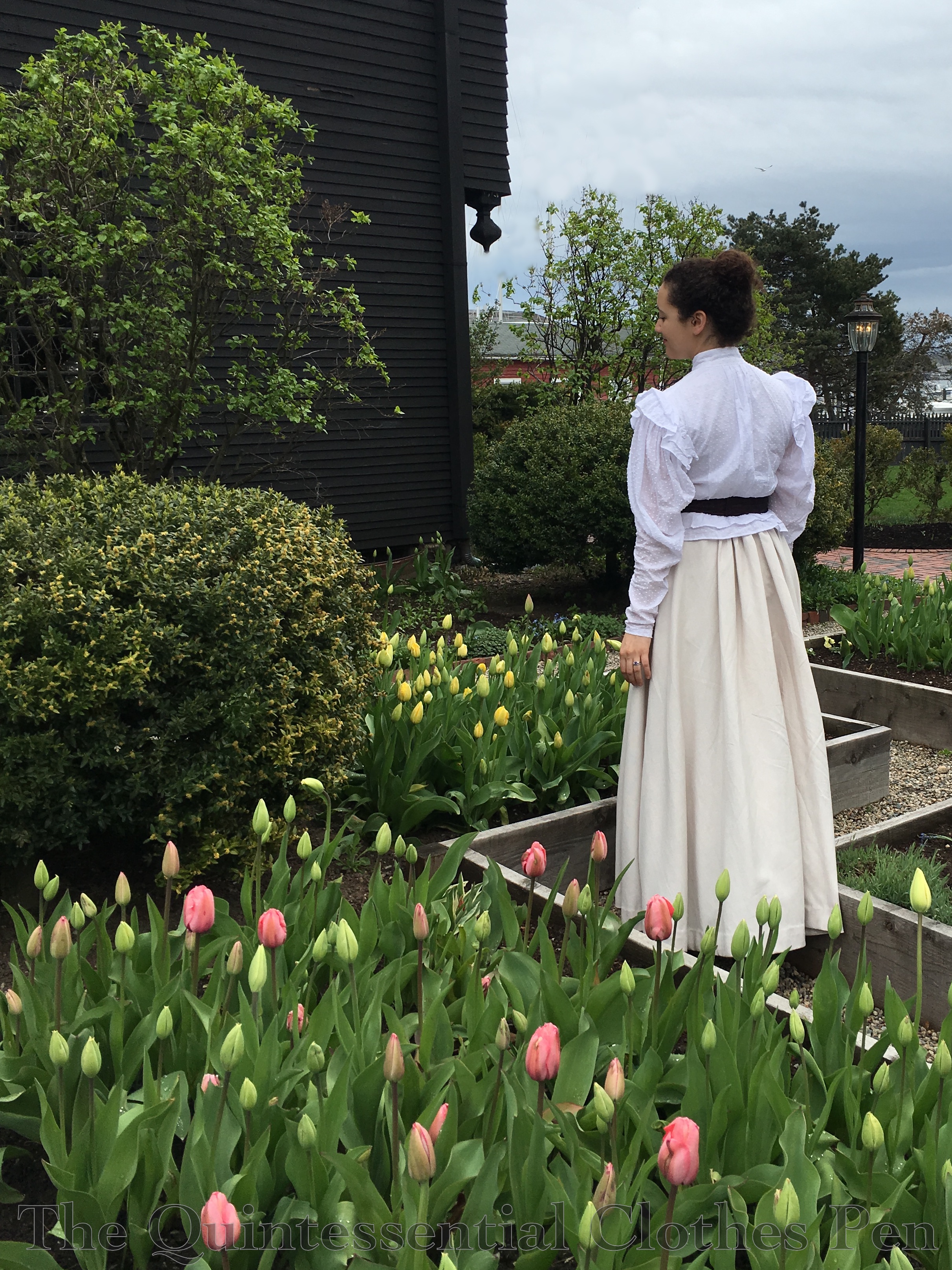 The new 1895 skirt is being worn with an 1895 blouse I made in 2012 as well as a silk taffeta belt and my super silk petticoat for volume. The last few times I wore this blouse I was wearing a skirt from about five years later. Not out of the question in terms of plausibility, but not as perfect in silhouette as I was hoping for. This time though, I was excited to have springtime pictures with an outfit in which all the clothing was from the right period!