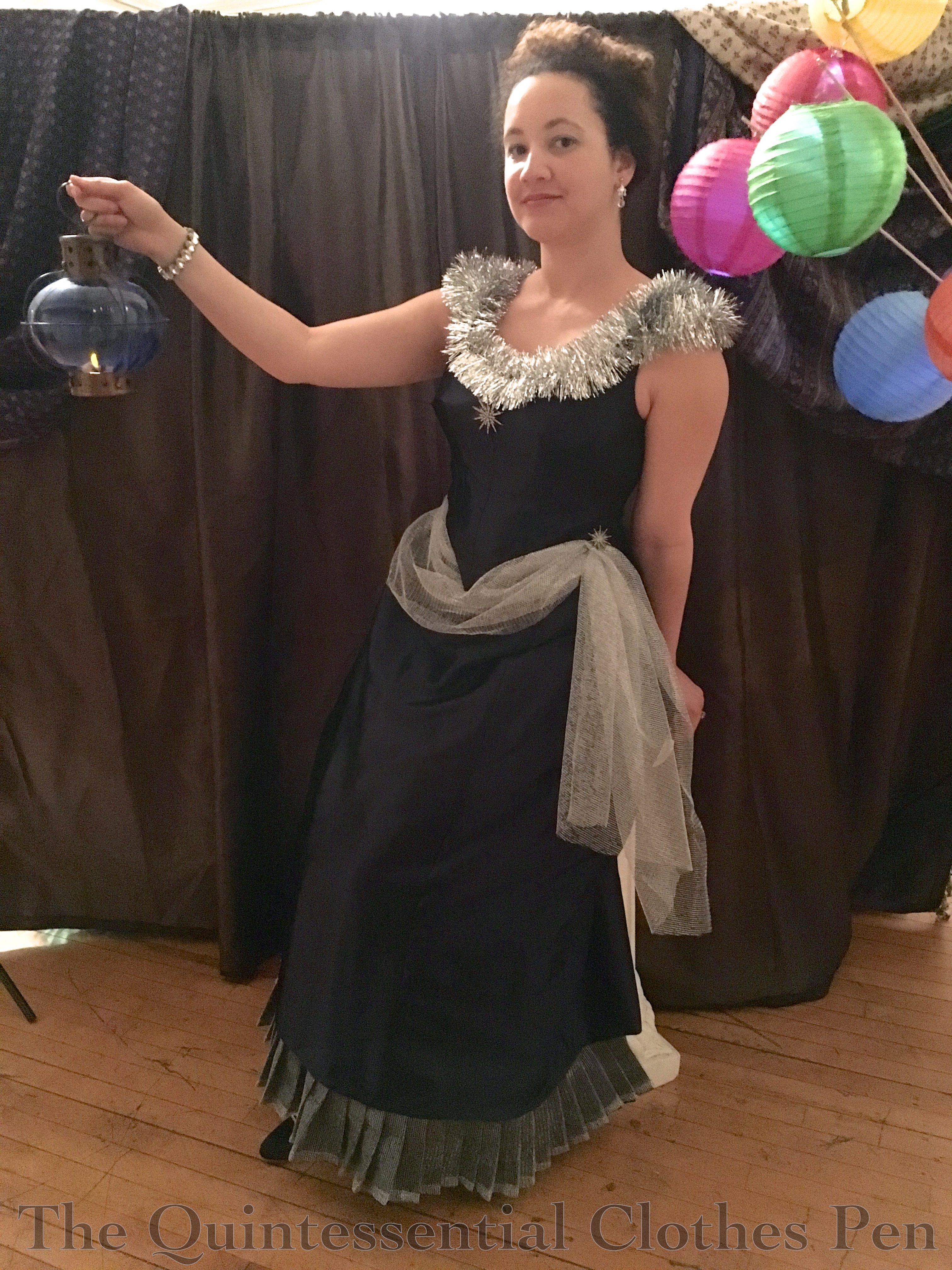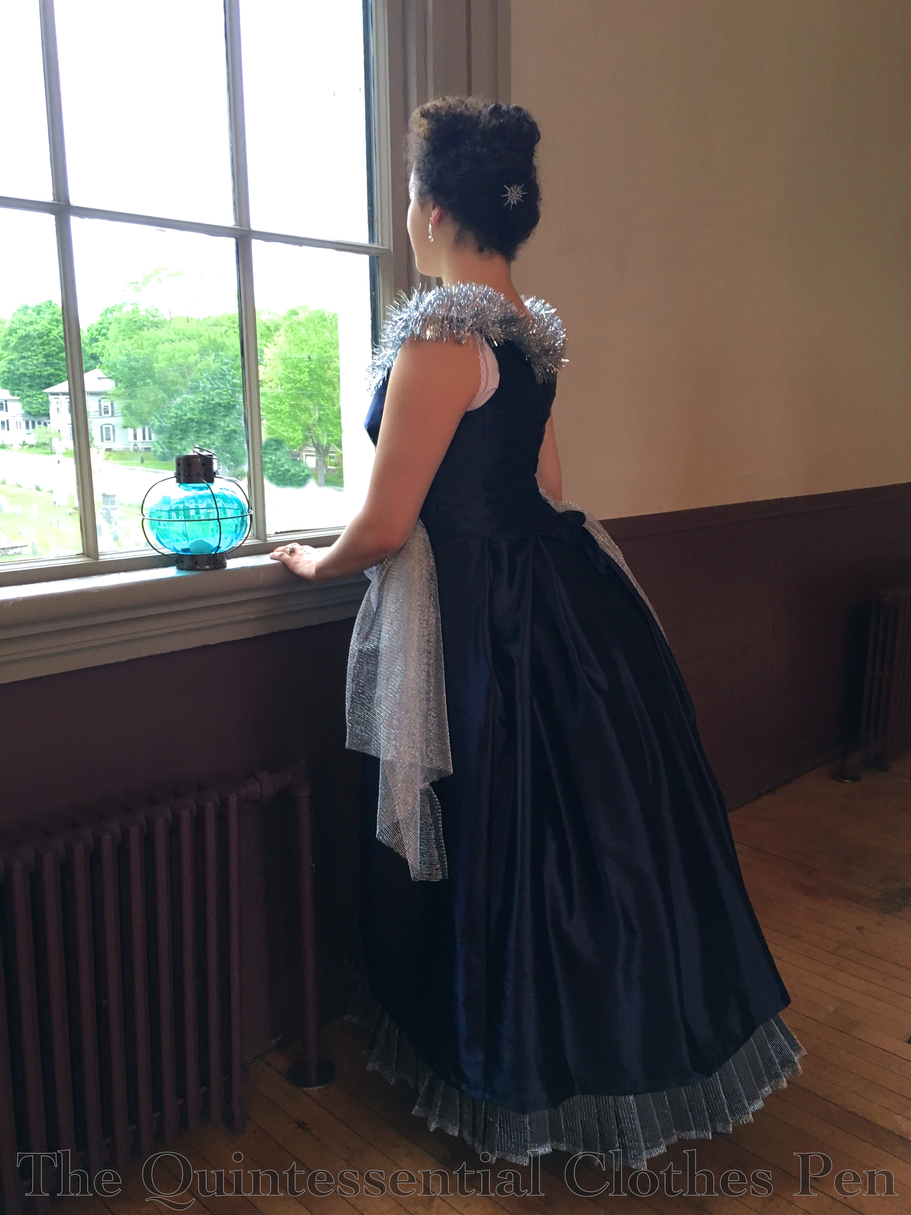 Design-wise, I was inspired by Mrs. Alice Gwynn Vanderbilt’s Electric Light fancy dress outfit made by Worth in 1883, but wanted to adapt the idea to fabrics I already had on hand. Since the fabric I came up with was navy blue, I decided on Night Sky as my inspiration.