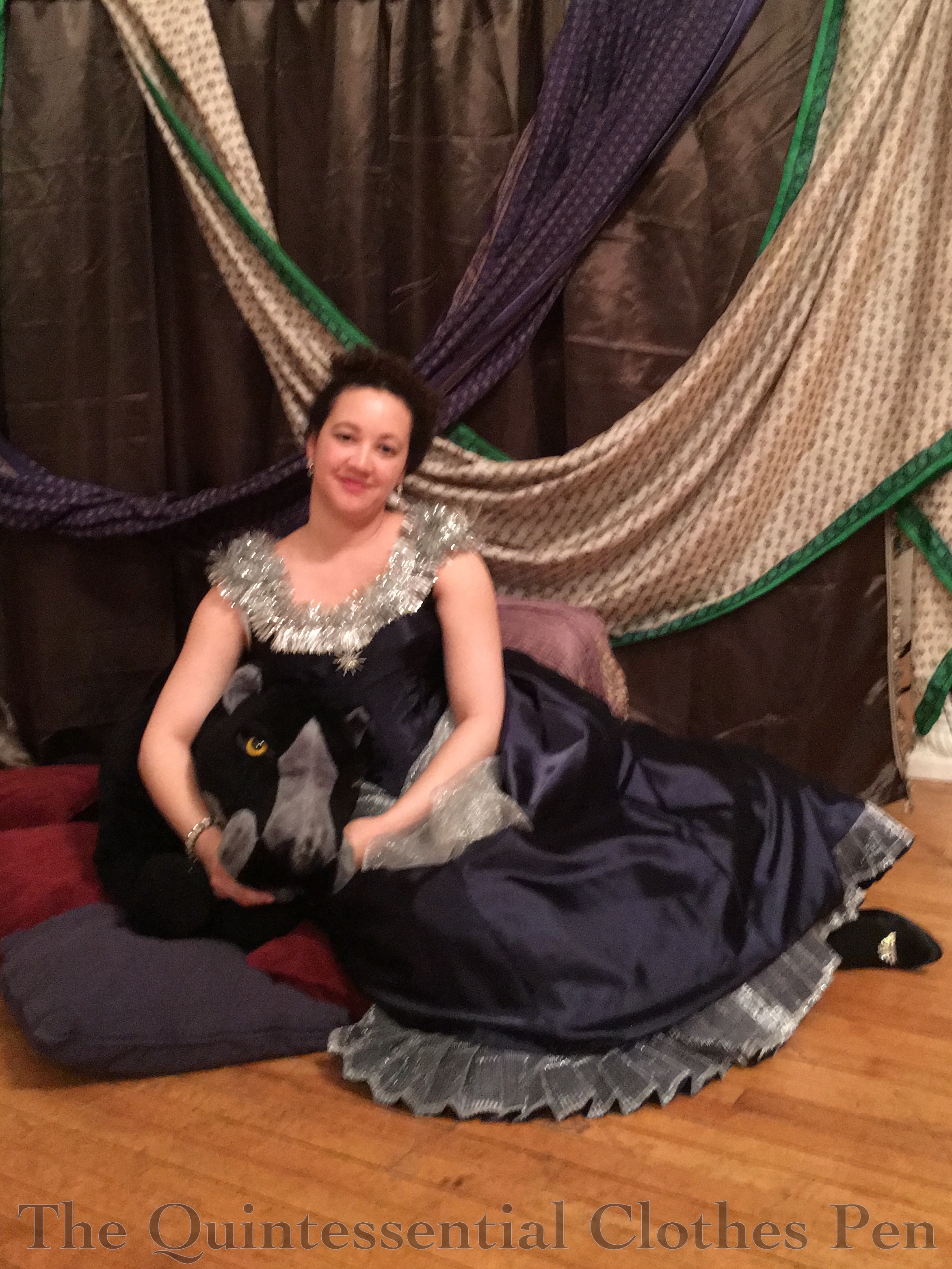 For this ball we set up a double sided picture backdrop, one side of which you’ve already seen. The other side included a large stuffed jaguar/panther I dubbed Jaggy for the night. You often see backdrops in regular Victorian photos as well as fancy dress photos. Unfortunately, with my heels on I was too tall for them! Oops! Being too tall inspired me to take some fun sitting photos.