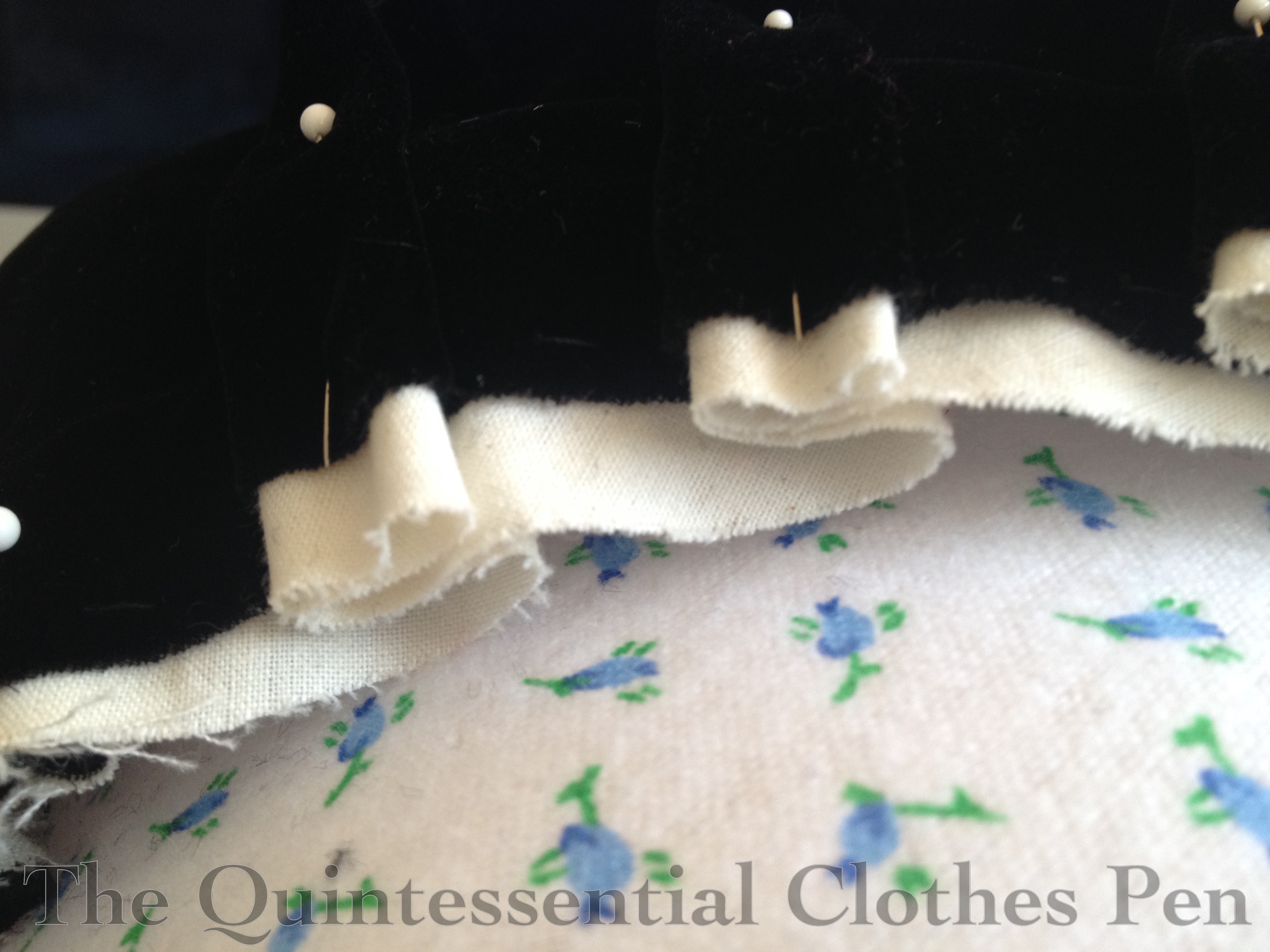 Here is the actual toque in progress. You can see the floral cotton flannel mulling layer that is between the buckram base the the velvet exterior. You can also see that I used my mockup poof to flat line my velvet poof in order to help the light silk velvet hold its shape. This picture also shows the double, or stacked, pleating around the poof.