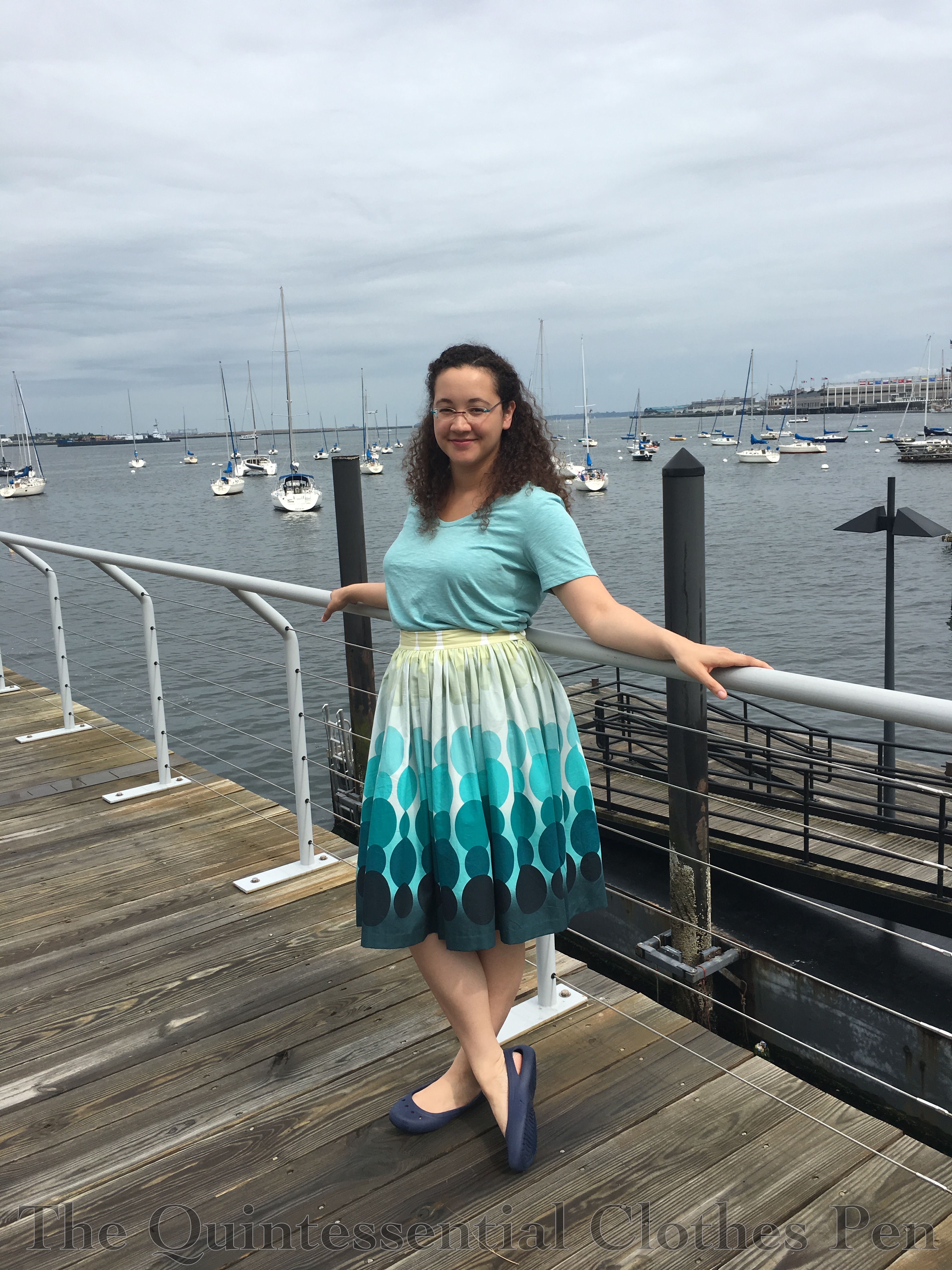 It looks pretty snazzy with a petticoat under it, so I’m hoping to have some excuse to wear it someday as 1950s instead of modern. In the meantime, I’ve worn it with a variety of white and oatmeal colored tanks and tees, both of which are nice continuations of the ombre effect of the skirt pattern.