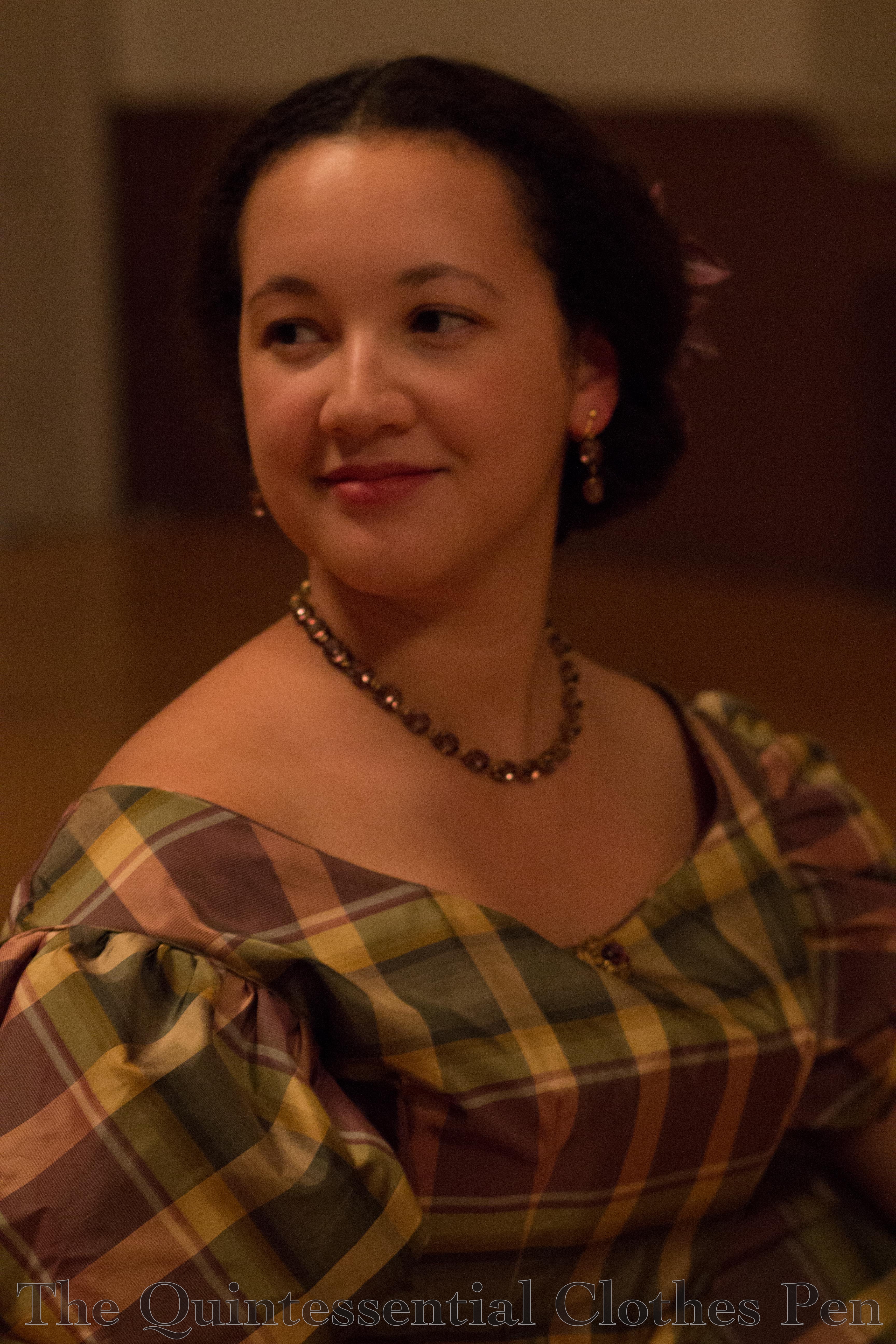 I collected images of plaid gowns with a focus on evening bodices and noticed these features, which is why I decided on them. The most useful images are in one place here, on my Pinterest board for the project. I was contemplating the sleeve type when I came across Eleanor ‘Felcie’ Bull. Interestingly, she shows all of those traits I’d decided on. I loved her simple sleeves and restrained bodice trimming, which then set me on an extensive Ebay and Etsy hunt to find just the right brooches to replicate her style. Yes, I did look through about 150 pages of bow brooches to find just the right one for less than $15. Plus many pages of gold oval brooches. I couldn’t have wished for better results! Remember the look I gave you a look a few posts ago? The only thing I did was to brush the oval brooch (which is new, not vintage) with a bit of brown acrylic paint to bring it down to the old gold color of the bow brooch.