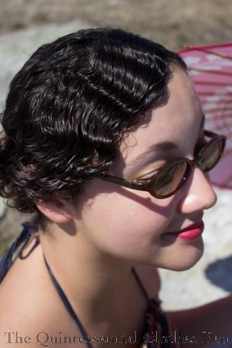 I tried a forward thinking 1930s inspired hairstyle for the weekend. I did it early Saturday morning before hitting the road and then wore it all weekend without a change. It went from day to evening with no problem and stayed in place through wind, hats, and sleeping. (This is the same hairstyle I hinted about in the post about my 1927 Blush Sparkle Dress.)