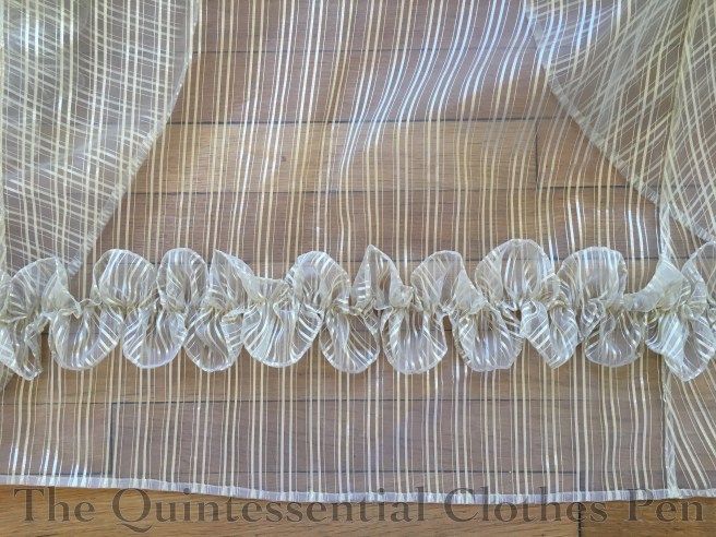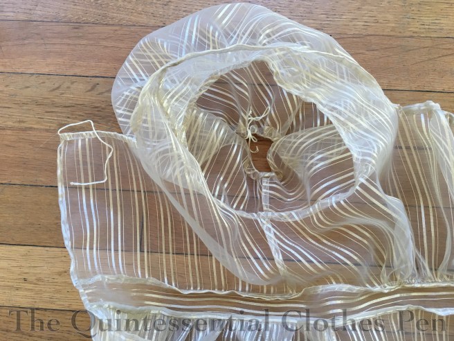 I’d been on the look-out for a sheer with black stripes but hadn’t found anything suitable. Once I found the curtain fabric, I debated whether to use it for a dress in this style or to hold out for the black stripe. As you’ll see, I decided to call this inspiration fulfilled by the gold striped fabric that I found. It’s polyester, but that means it was a good price. Occasionally, a polyester can be just the thing.