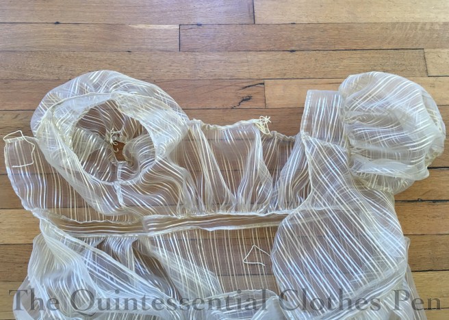 The bottoms of the sleeves and the front and back necklines are all adjustable with tiny drawstrings made from champagne colored embroidery floss. The goal was to have ties that would blend and not be noticeable through the sheer fabric.
