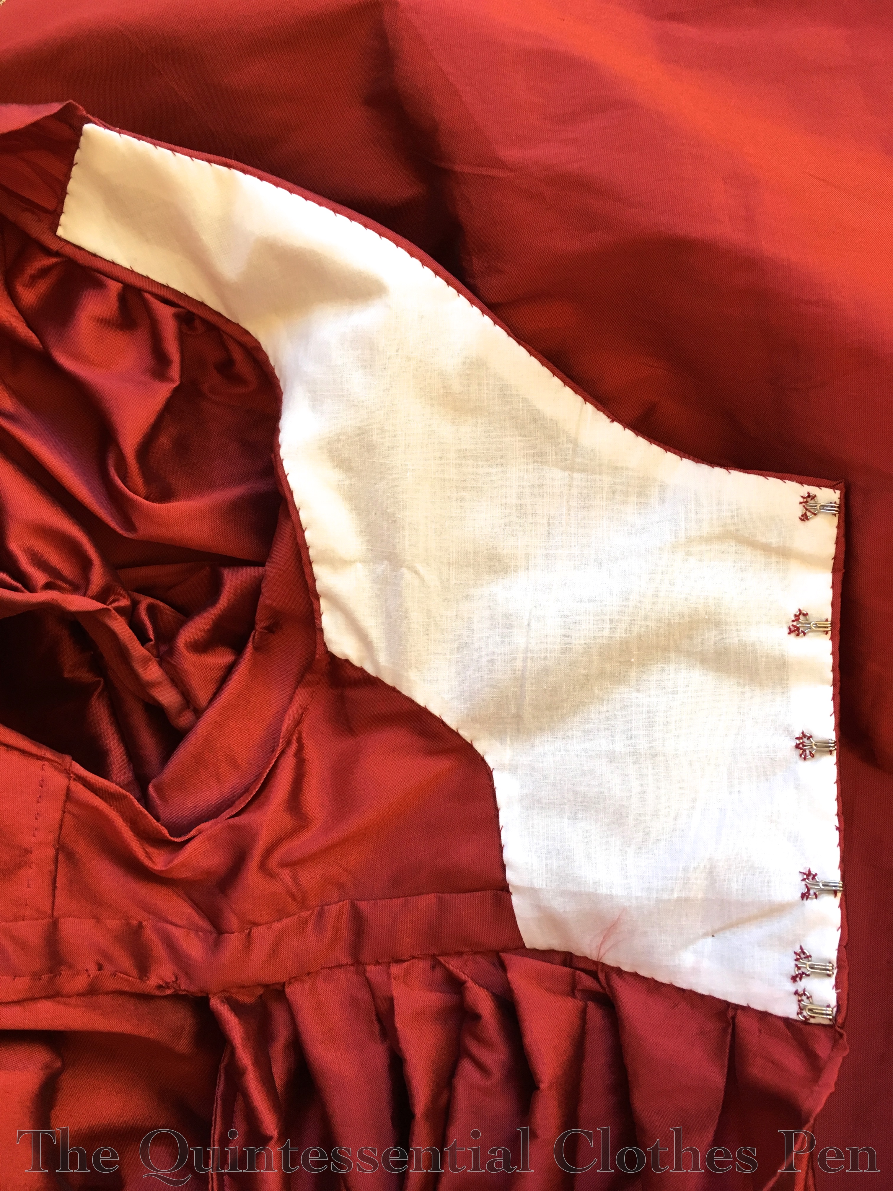 It’s always closed with hooks and eyes, but when I went to wear it last year it wouldn’t close! With some safety pins, we got it to this point, but I was afraid for the integrity of the fabric because it was stretched so tightly.