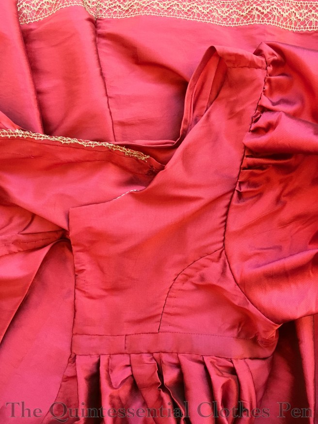 Sometimes, this would bother me. But it’s only noticeable in some light and I hope that eventually the pieces will also brighten. Plus, it’s entirely historically reasonable to piece a gown using more of the fabric that hasn’t faded in the same way as the rest of the garment to adjust the size. It’s much more practical than making an all new garment!