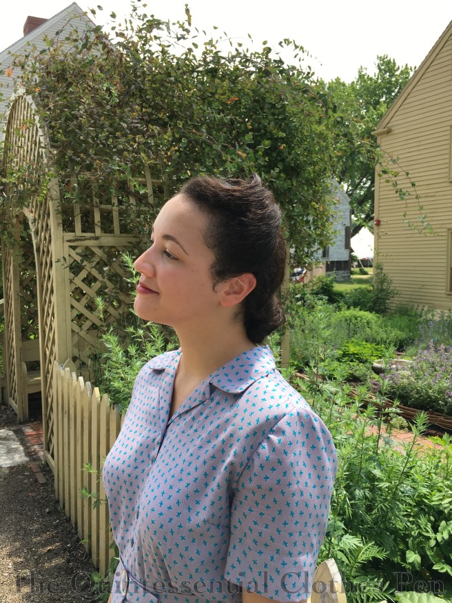 I really wanted to try victory rolls as a hairstyle to accompany my 1943 mauve dress. This was in part because they’re so iconic (though not universal, which perhaps means that we shouldn’t all represent them, but still, I couldn’t resist) but also because my hair texture proves to be such a challenge that I had to take it on and see if I could subdue it to my will.