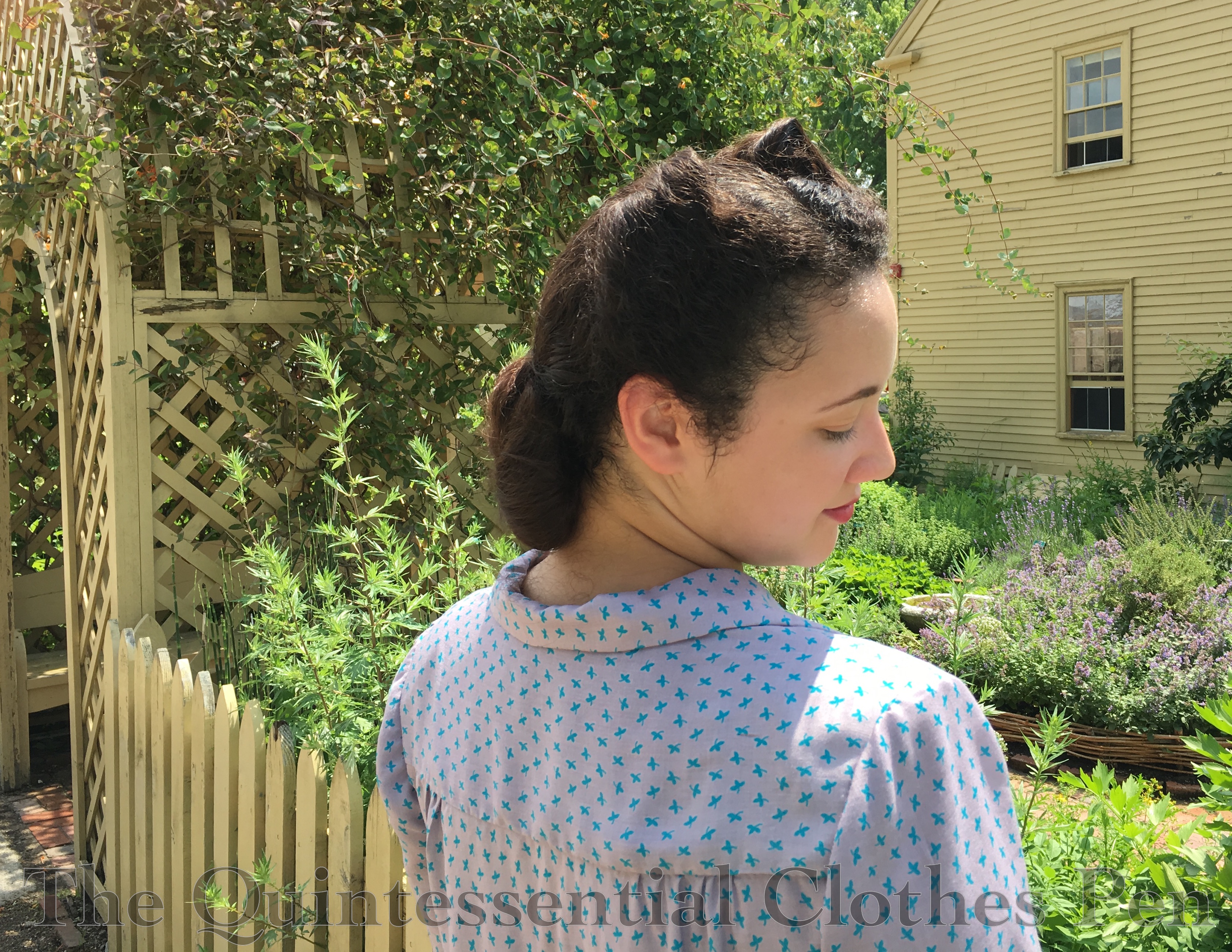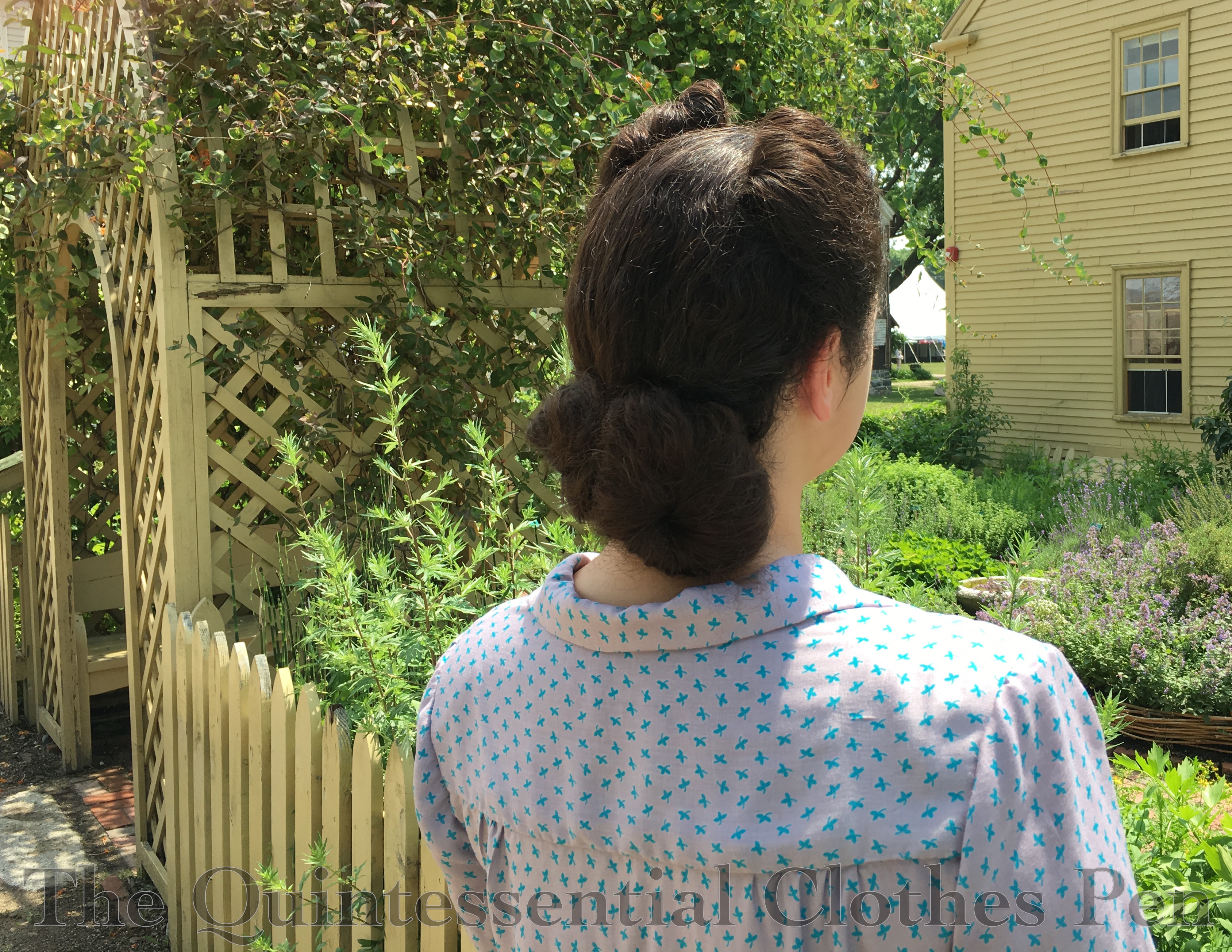 The other obstacle presented by my long hair was what to do with the back of it. Most of these hairstyles were achieved with hair much shorter than mine, which was easier to tuck up into cute 1940s shapes in the back. It was much harder to find inspiration for what to do with long hair. Eventually, though, I came upon an image which shows two asymmetrical buns in the back.