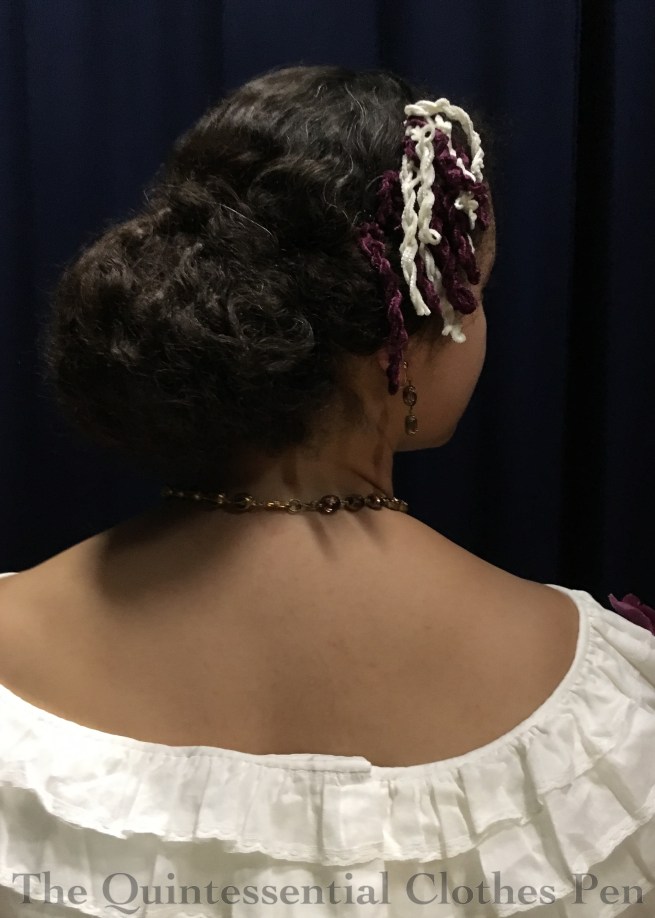 It’s charming, right? I thought it would be silly, fun, and different, so I went on a hunt for chenille yarn to complement one of my mid-19th century dresses, Annabelle. It was rather harder than I thought it would be to find just the shade of purple that I was looking for as well as an off white, but I persevered and found them on Esty.
