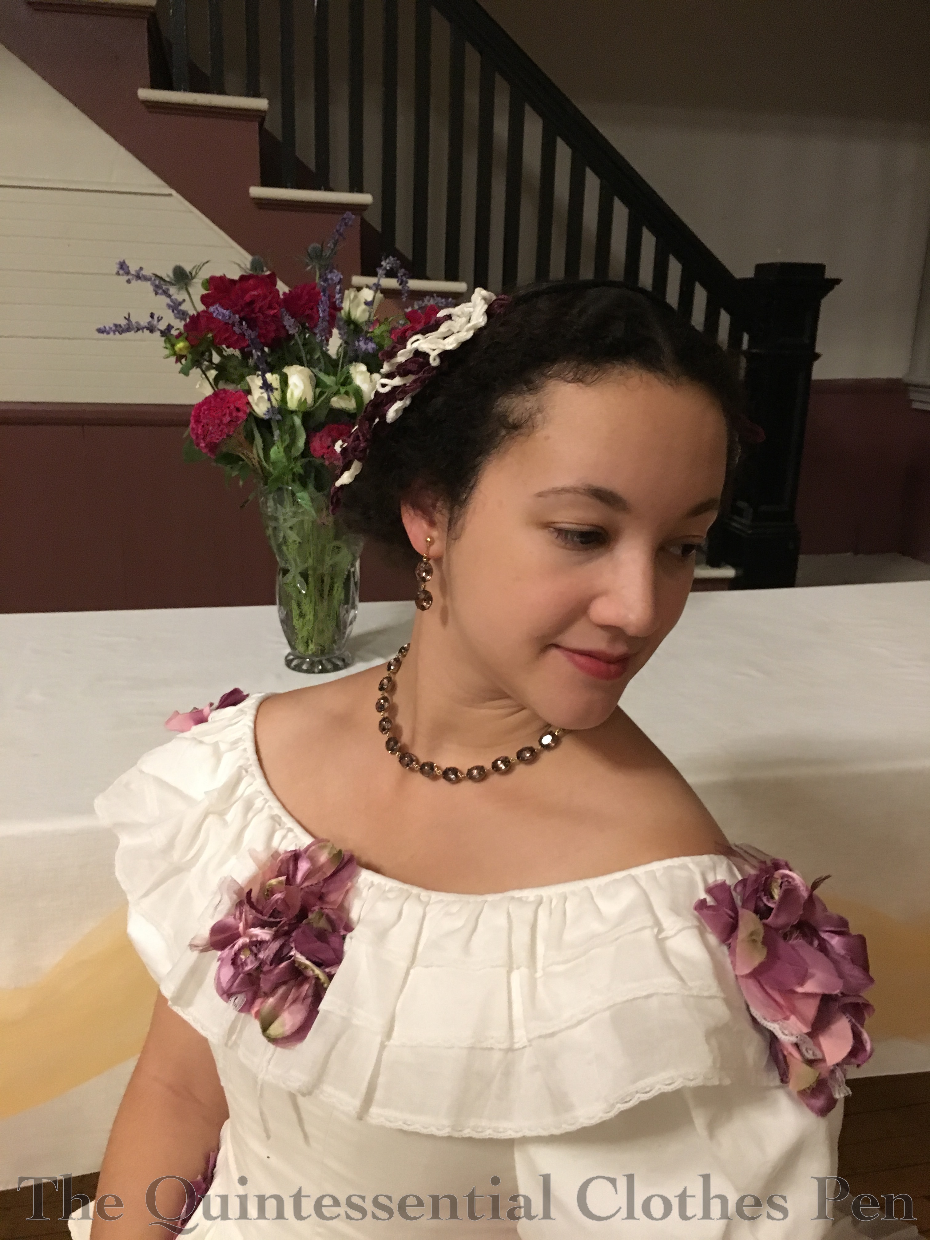 It’s been almost exactly a year since the inspiration for a new mid-19th century headdress stuck in my mind. I was attending a workshop at the Civil War Weekend last October and watching others make lovely floral headdresses with low hanging flowers, like this. Another inspiration headdress was similar in having two sections of decoration on each side of a headband, but made of loops of silk chenille rather than flowers. I decided then and there that I wanted to try out this more unusual style. The image below was my main inspiration, followed by a similar style made of silk ribbon.