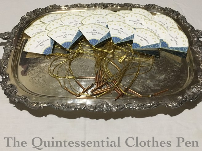 As the title mentions, I was able to wear this ensemble to a mid-19th century Victoria and Albert themed ball. In addition to the usual loveliness of balls (live music, refreshments, etc.), we had added decorations, special fan shaped dance cards, a quadrille performance, and sashes. Here are the dance cards laid out on a silver tray in the entryway.