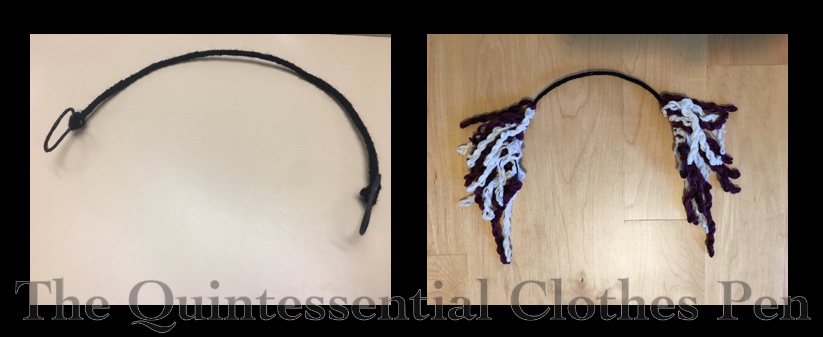 The base of my headdress is millinery wire. I formed loops at the ends in order to have a section to easily bobby pin to my hair. The over-the-head millinery wire is covered in black acrylic yarn from the stash to blend in with my hair, while the ends are black because I colored them with a sharpie–easy and quick. No yarn to get stuck in the bobby pins on the ends.