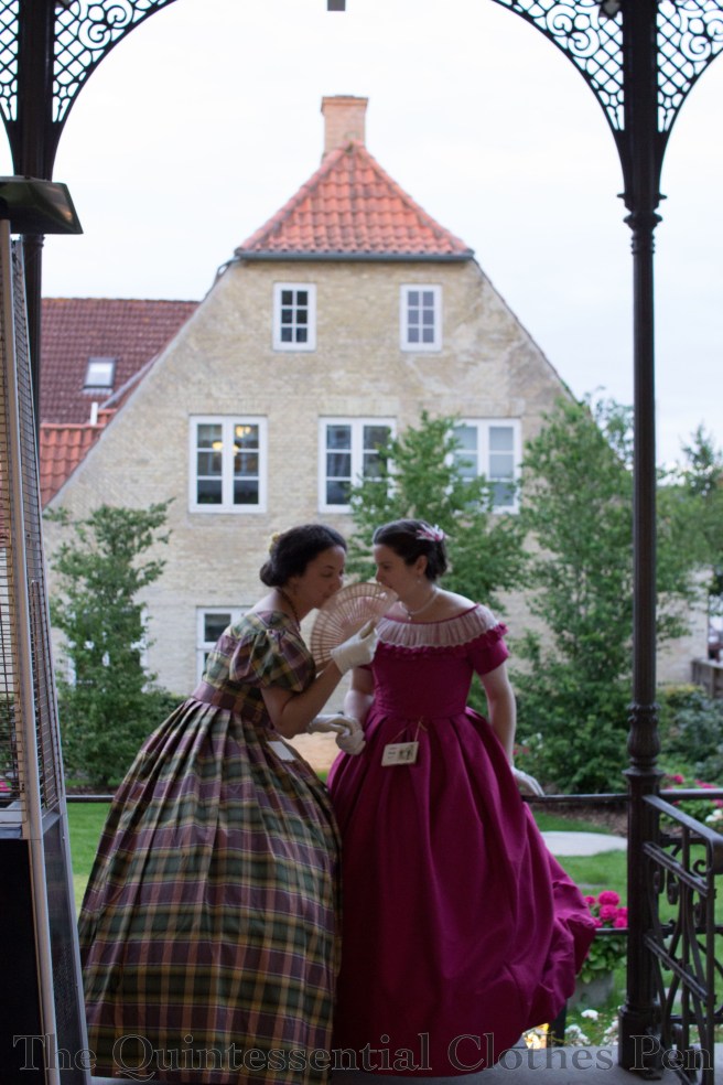 So here I am dressed for the informal ball. My hair was frizzy and big by the evening of the day so I decided to run with it! Big round hair is perfect for the 1858 anyway. I wore Georgina, with her evening bodice. Actually, all of the Americans wore our mid-19th century cotton ballgowns (many of which you can see in this past post), which quite impressed many of the other attendees. We were told that fabrics like these are difficult to find in and around Denmark.