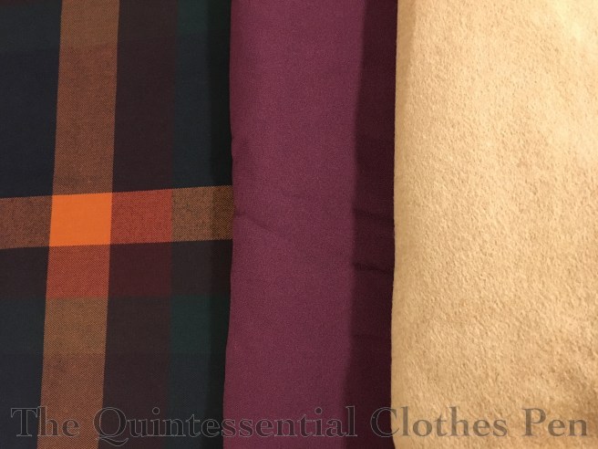 I’m starting to turn my sewing attention away from summer and towards fall and winter with a modern autumn plaid dress, a 1930s blouse, and a 1920s coat! Here’s a peak at the fabrics I’ll be using for these projects. Mmm, what a lovely autumnal palette!