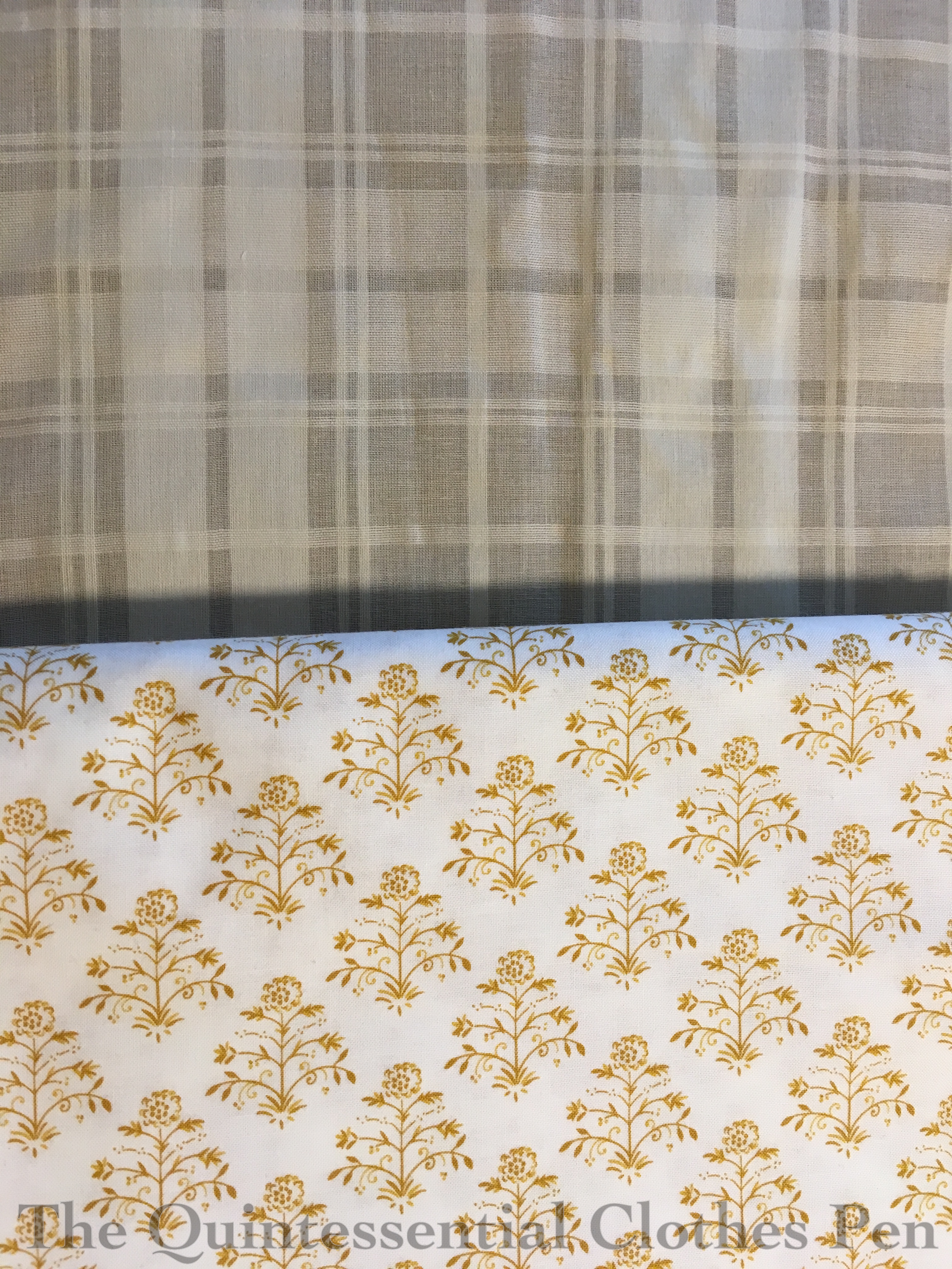 The lower fabric is a cotton print that looks perfect for a Regency dress! I’ve been wanting a yellow on white cotton for at least a year, but hadn’t found just the right one in a price I wanted. The only downsides about this one are that it’s not block printed and that the weight is a quilting cotton rather than a lawn or voile. But I liked the colors, motif, and price enough to buy it. I finished off the bolt on this one! Whew! I’m glad there was enough for my Regency dress idea.