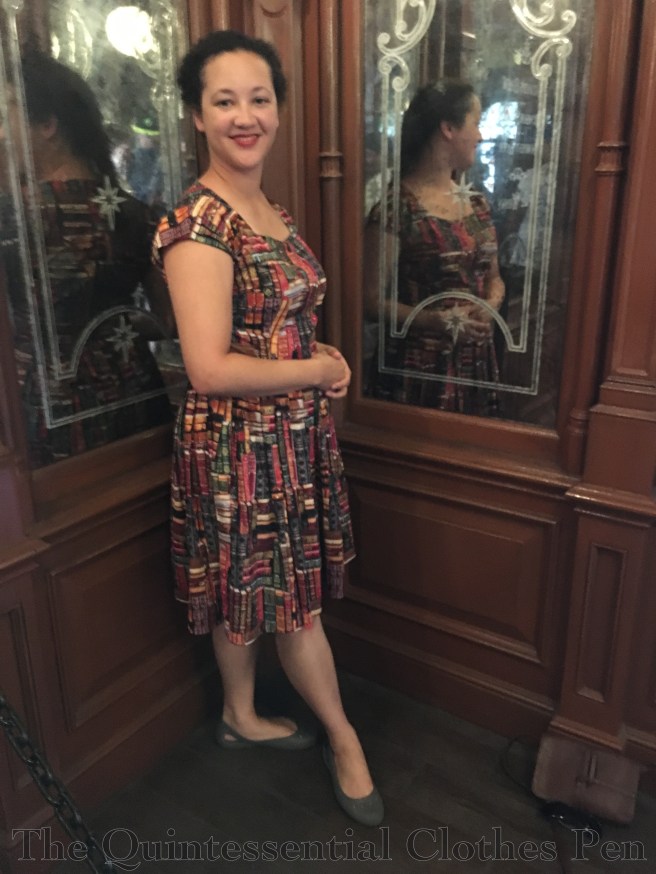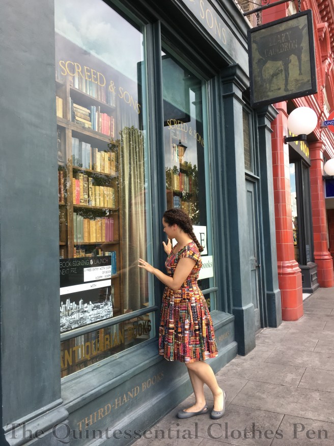 That was back in 2016. It took me about a year to get around to making the dress, but I finished it in late 2017. And I’ve been wearing it! It just took another year to wear it somewhere that was good for taking photos. (I still hold out hopes of taking photos of it in a fabulous wood paneled library, while holding my hardcover copy of Gone With The Wind. That’s one of the readable titles on the dress! Not sure when that will happen, though.) In the meantime, I’m very pleased with these photos from my trip to Universal Orlando, where we took photos of this dress in various Harry Potter locations.