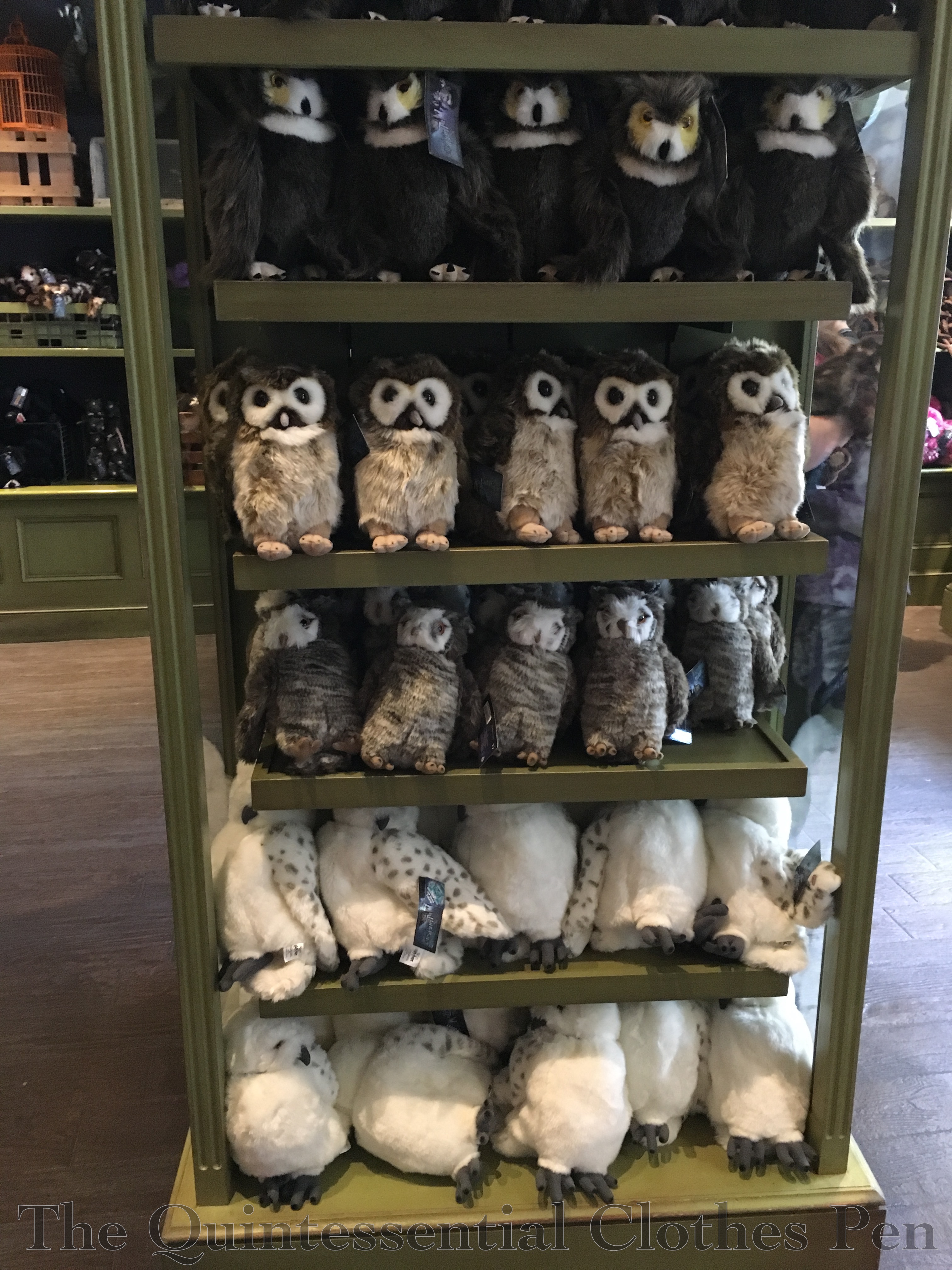 This is in the Magical Menagerie. Mr. Q visited the park without me while I was in Denmark in 2017 (I was sad, especially because he doesn’t particularly care about Harry Potter or know any details, but I was in Denmark so I couldn’t really complain!). He brought me back an owl from the middle shelf, which I call my House Owl, because it was a belated housewarming present and it’s like a house elf…! (You know, I don’t think you could buy a stuffed house elf anywhere. Surprising, because it seems like the sort of thing you might find in Knockturn Alley, perhaps…) All of these owls are characters in the books. I think the top one is Draco Malfoy’s Eagle Owl, the brown one is the Weasley’s old owl Errol, the grey one (my House Owl) is Ron’s owl Pigwideon, and the bottom one is of course Harry’s snowy owl Hedwig. Some if not all of the Hedwig’s are backpacks, which is super amusing and cute but seems like it would get grimy awfully fast!