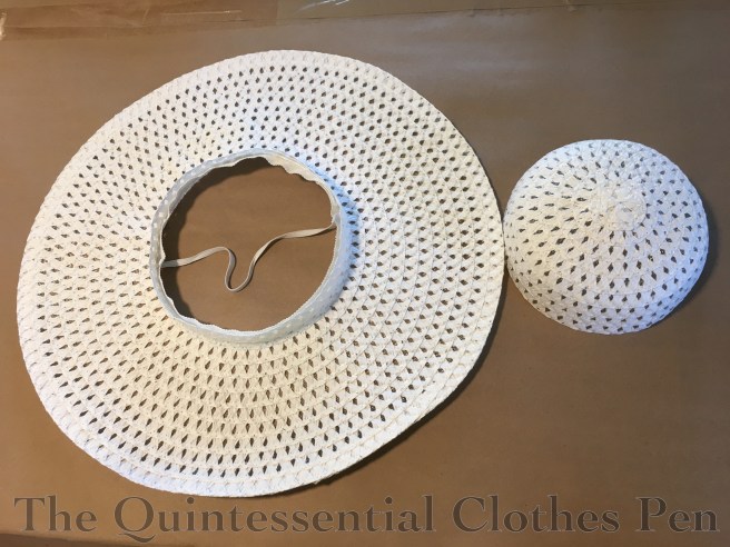 I started with this modern ‘straw’ hat from eBay. I say ‘straw’ because the fiber is really plastic rather than any sort of natural material… but I digress. The price was good and I thought white would be a nice neutral for my 1920s summer wardrobe. But the crown on this hat was soooo tall! 5″! It came way down over my eyebrows and combined with the floppy brim it was not a great look nor was it historical. I think I tried to wear it a few years ago but was displeased with the shape. The only bonus is that it squishes well and pops right back into shape–that’s great for packing! (As a side note, in trying to find the link for the hat I realized I ordered this back in 2015… it only took me a few years to make it something I was really pleased with!)