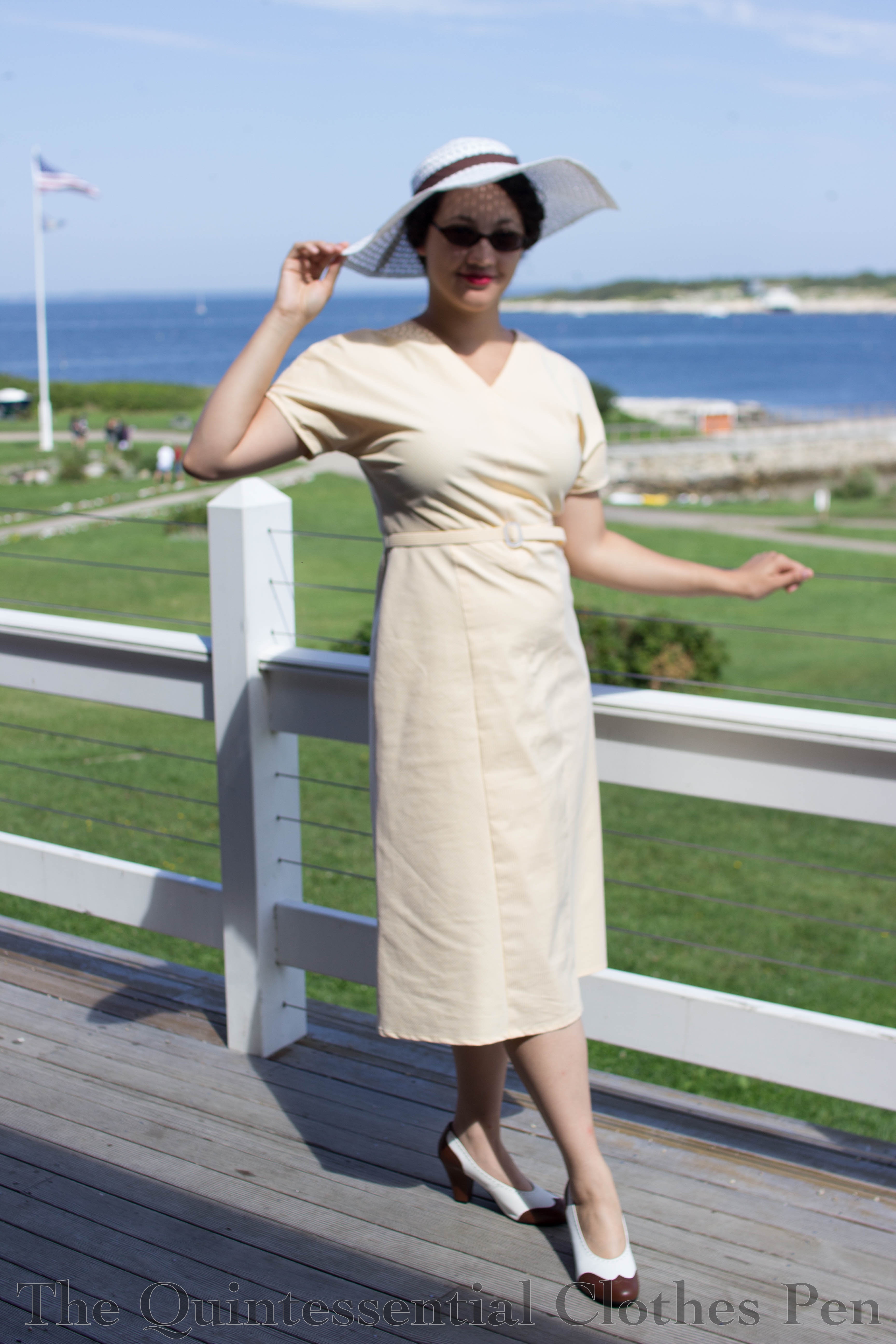 While trying to decide what to accessorize my 1933 dress with, I looked at the hat in my closet and wondered if there was anything to be done to make it better. I figured the white would coordinate well with the white stripes in the dress fabric. I looked for hat inspiration on my 1930s sportswear Pinterest board and 1930s day wear Pinterest board and decided that the main problem with my hat was the tall crown. I wanted a hat that just perched on my head, so I needed to shorten the crown.