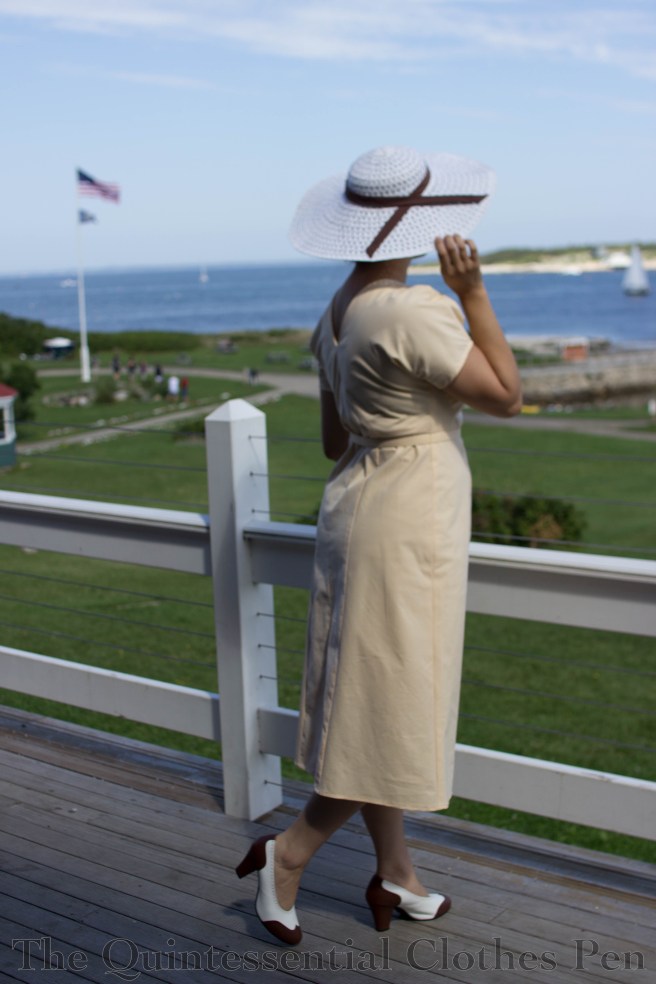 I decided on a simple brown band to trim the hat. I had the brown cotton in my stash and it matched my shoes well. It is nicely complimentary for the outfit without being match-y and it’s neutral enough that I can easily wear this with other outfits as well. The brown is carefully hand sewn around the crown with the ends spreading over the brim of the hat. Ta da! Elegant sun protection!