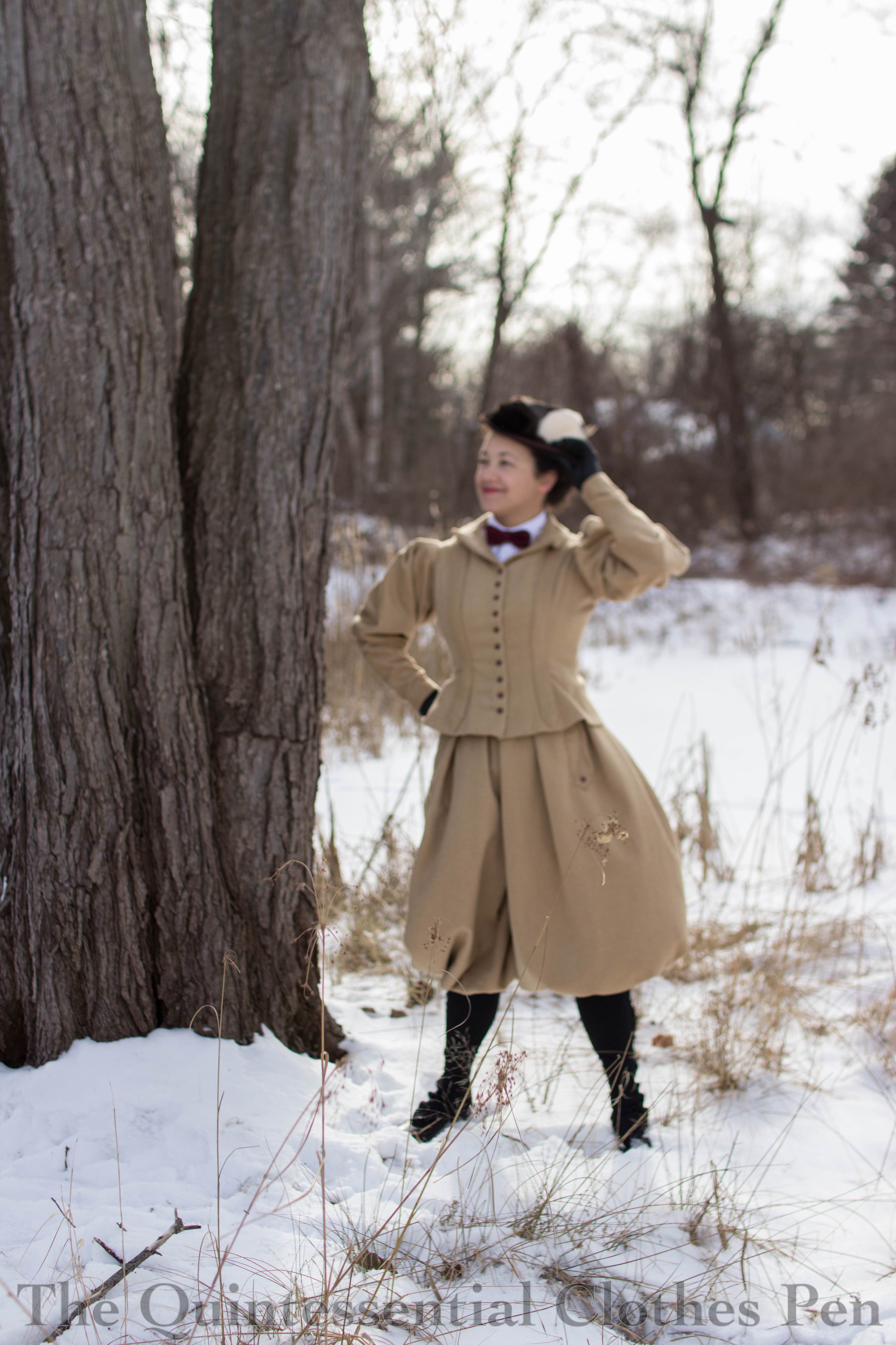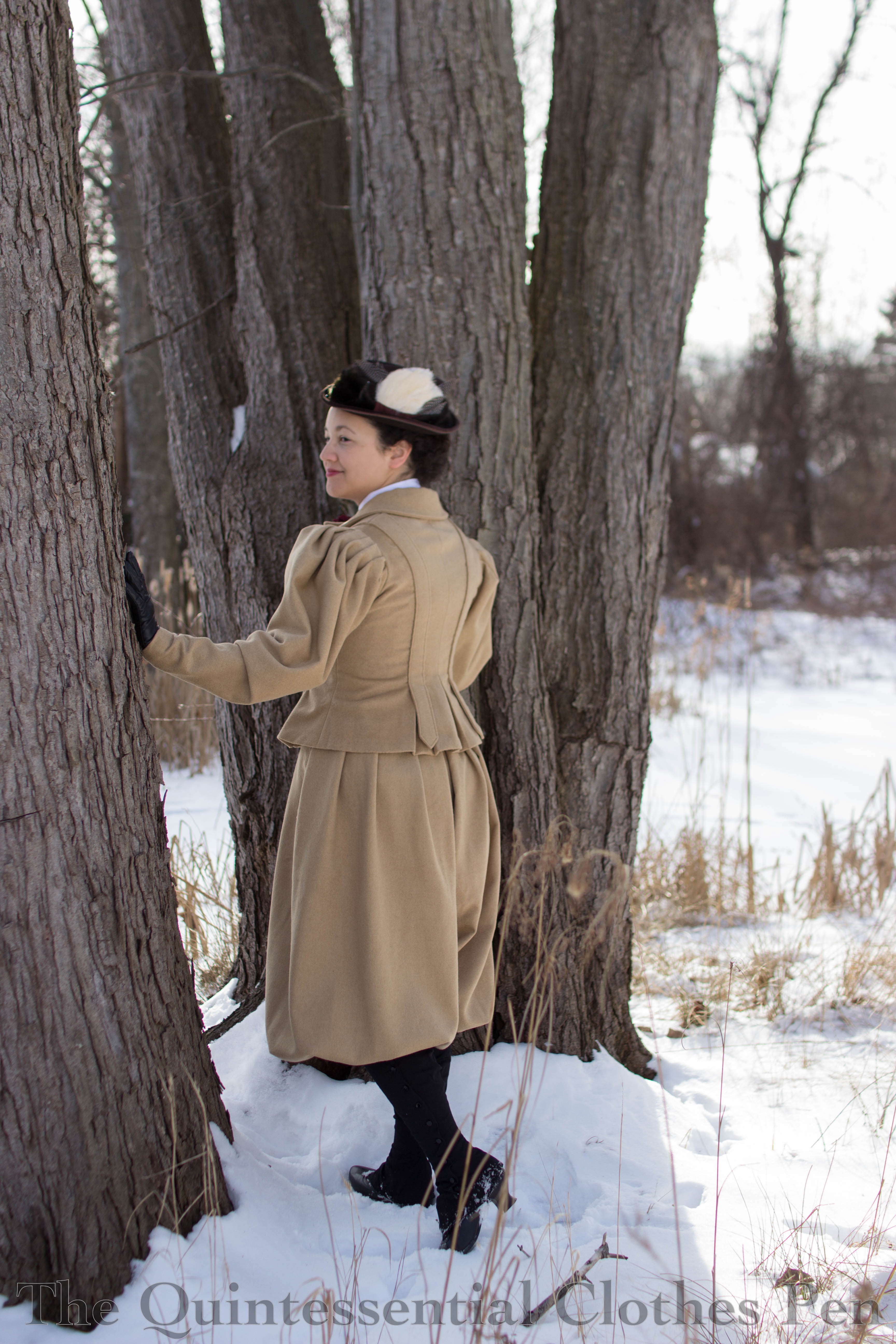 I wanted to have a tailor-made style with a lapel and collar that would follow the general style of men’s jackets in the 19th century. Most bicycling ensembles are of this style, due in part to the fact that this type of activity was traditionally a male pastime. The specialty clothing produced for men’s active pursuits was made by a tailor, so it follows that women’s clothing began to be tailor-made as well as they joined in these male activities in the later part of the 19th century.
