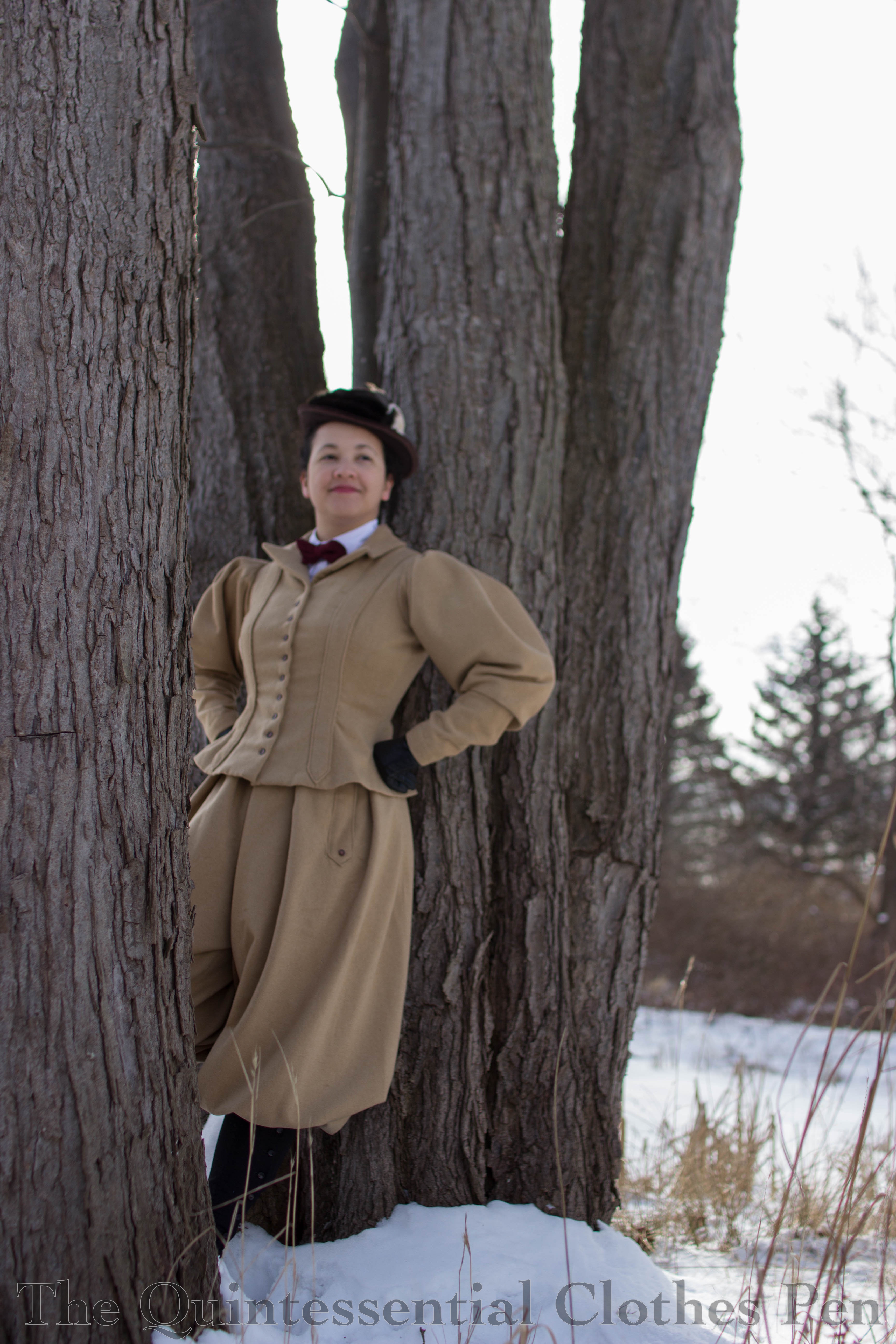 If you want to read a bit more about the social history of the bicycle ensemble, see more finished ensemble photos than the few in this post, or read more about the accessories I’m wearing with this ensemble, check out my first post about it (this is the same as the first link). I also have a post looking specifically at patents and advertisements for women’s bicycling clothing from this time. It’s a great supplement to some of the information I mention in that first post.