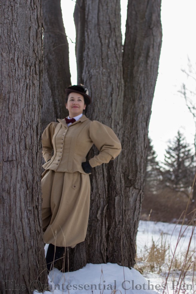 To recap, all these details and construction steps produce this! Slightly subdued 1890s puff sleeves, tailored jacket details, interesting strapping patterns, and bloomers!