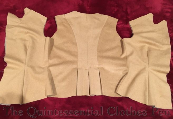 And here’s the jacket at the same point in the process, turned over to see the inside. Now the flat lining is clearly visible, as are the box pleats along the back seams. You can also see the canvas that runs down the fronts.