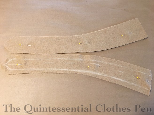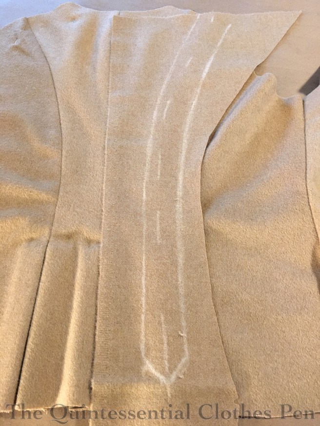 I laid the jacket out on the table with a scrap piece of wool on top of it, put pins along the seam line to mark the location (so my strapping would hide the seam), and then drew a strapping shape I liked around that. As you can see, I didn’t follow the curve of the seam perfectly. That was an intentional choice, as I wanted the strapping to have a similar curve as the curve on the strapping of my inspiration jacket (here is the link to that again, in case you want to take a look and not scroll all the way up to the first link).