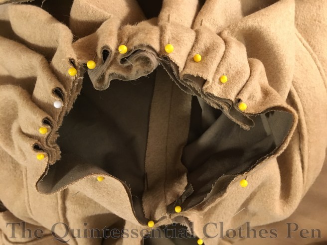 The sleeves are pleated to take in the fullness to fit the armsceye. There are 10 pleats total, each about ½” (1″ total) in depth. Here’s a photo looking down into the sleeve with all the pleats pinned in place. The box pleat (that is slightly off center in the photo) is the top of the sleeve when it’s set into the armhole of the jacket.