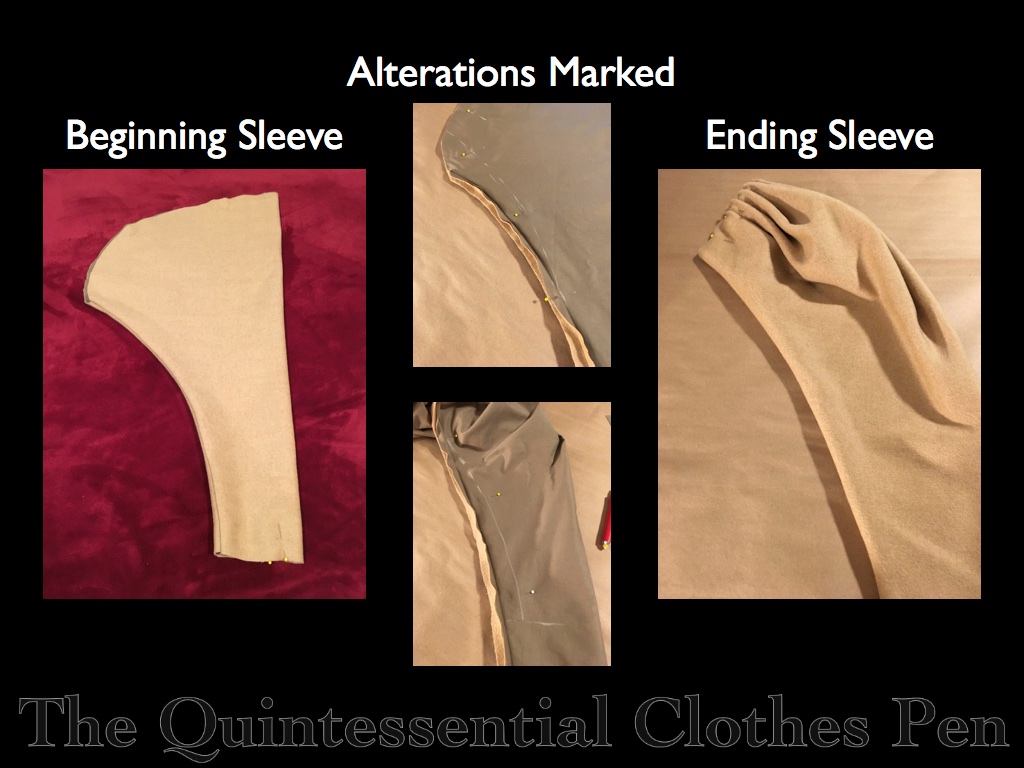 After trying out the original sleeve I made two major changes to the shape, angling the underarm seam at the top/making the top less full and angling the underarm seam at the bottom towards the wrist/shortening the length. After pleating each side of the new sleeve towards center I ended up with the sleeve shape on the right.