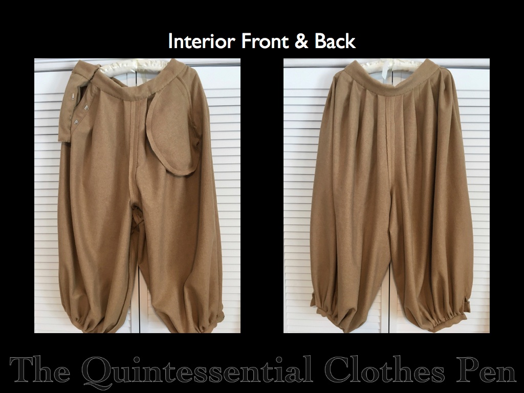 The inside of the bloomers looks like this. There are two decorative strapping details on the front of the bloomers (more on that when I get to the jacket). These conceal a placket opening on one hip (visible on the far left) and a pocket on the other! The crotch seam and inseams are left unfinished. This wool did a pretty good job of not fraying at the edges so there was no need to finish these seam allowances.