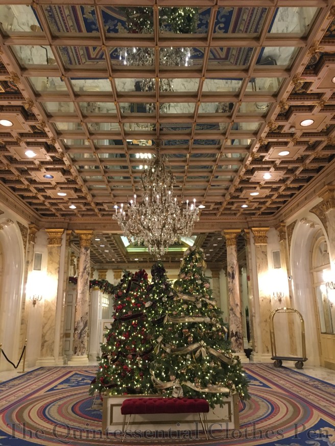 The holiday decorations were still up and they are lovely, but even without them I think we can all agree this is a pretty snazzy lobby. I believe it is still true to its original design from the opening of the hotel in 1912, with 21′ high gilded coffered ceilings, Empire style crystal chandeliers, and Italian marble columns (according to Wikipedia).
