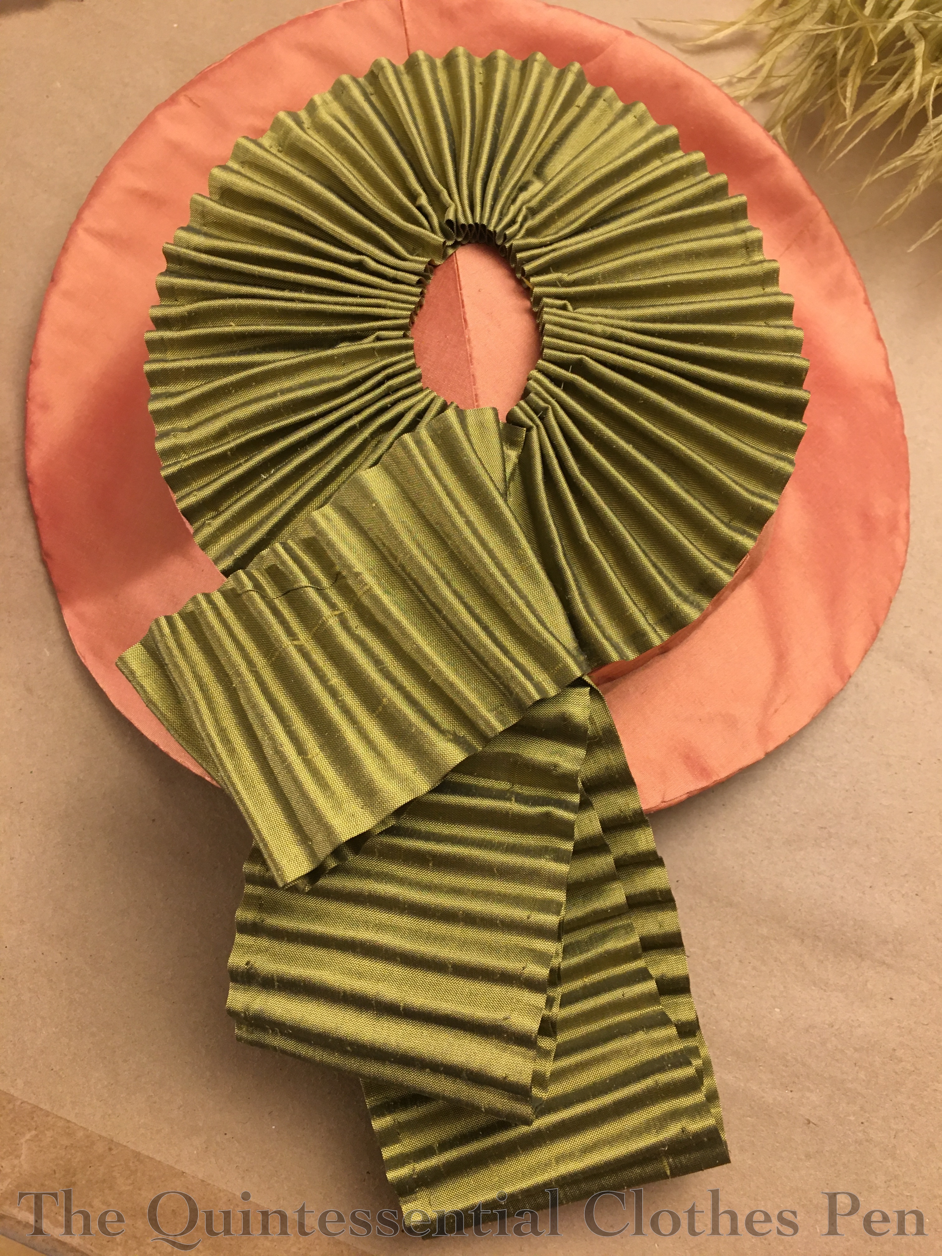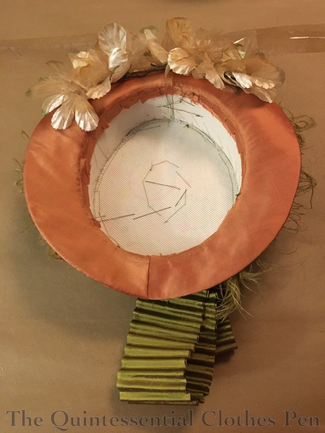 Once that was done, I attached the brim to the crown with sturdy hand sewn stitches through all the layers. These stitches were covered with a green silk band (that really can’t be seen after all the trim was added…).