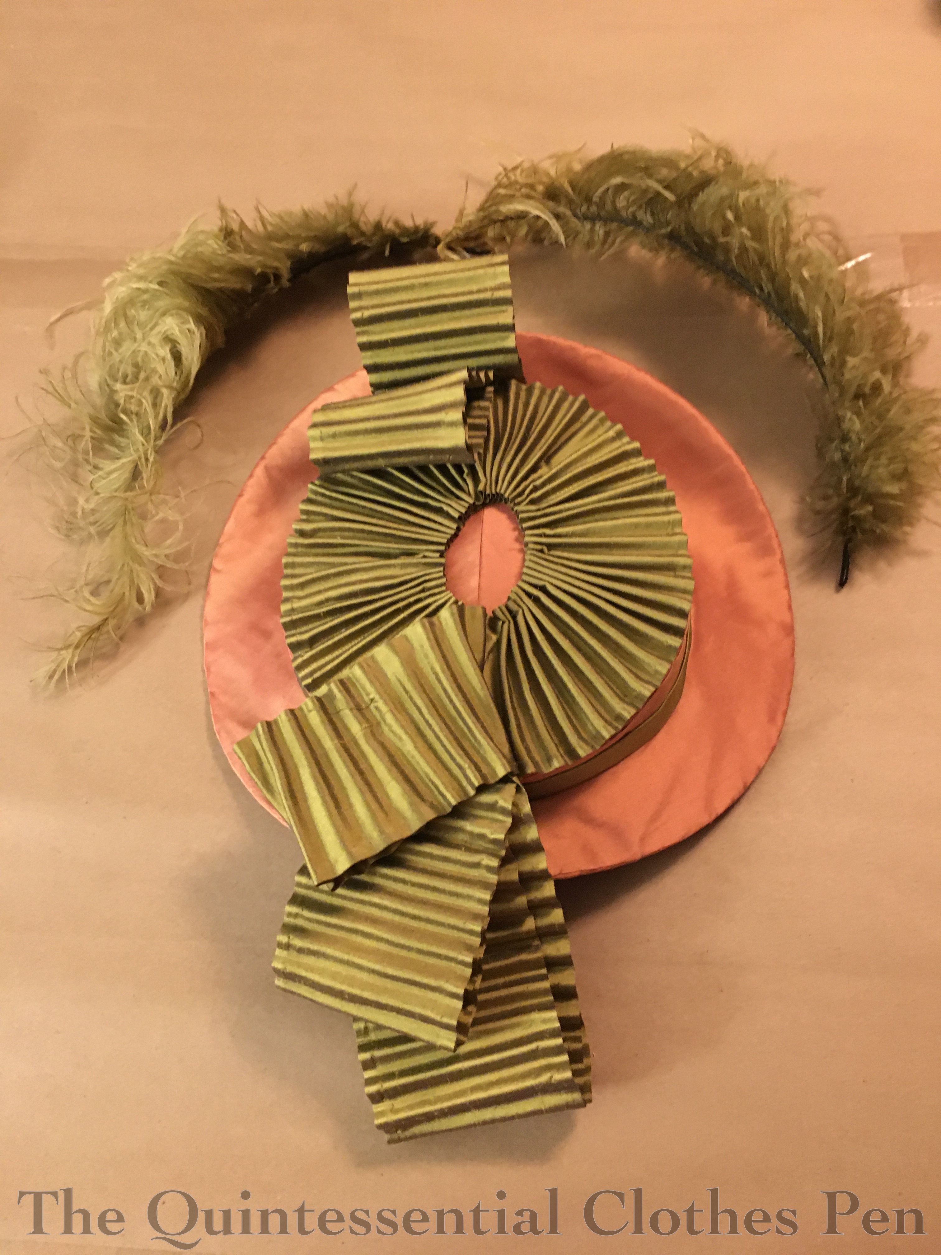 The tip of the hat is mostly covered by a radiating section of fluted trim with an opening in the middle that was eventually covered with flowers. There are loops of the fluted ‘ribbon’ trailing off the back of the hat as well as standing up in the front.