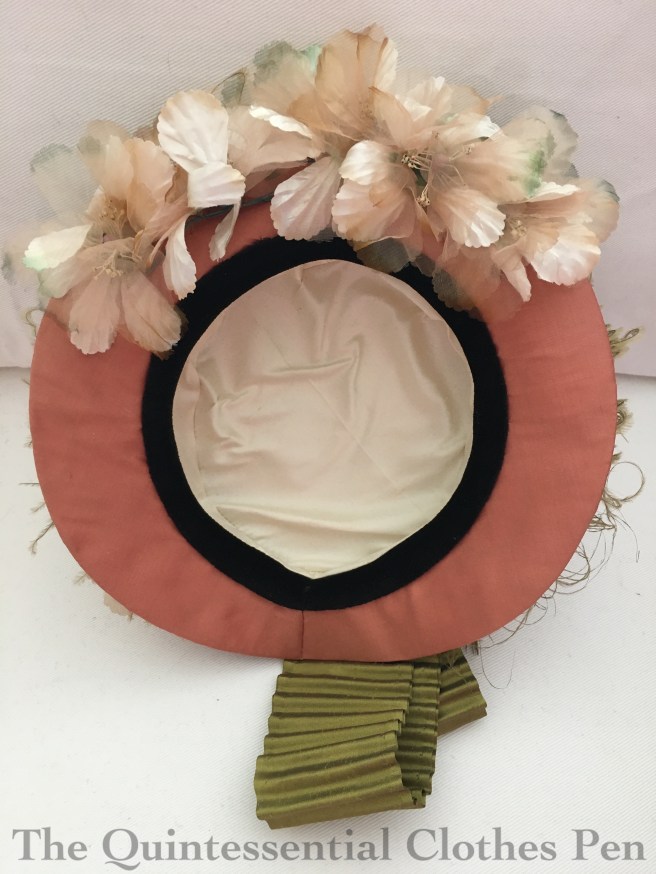 The lining of this hat is silk shantung, leftover from my 1903 petticoat. The join between the pink silk and the lining is covered by a band of brown cotton velvet. The velvet helps grip the hair to keep the hat in place. I chose dark brown because that will camouflage against my hair. (And, both the silk lining scraps and the brown velvet are leftover from projects in 2011, so yay for using what is on hand!)