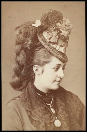 Along those same lines, let’s look at possible hairstyles from the years around 1875. Hairstyles changed throughout the 1870s, sometimes in subtle ways… and sometimes in not subtle ways! Here is not subtle for you.