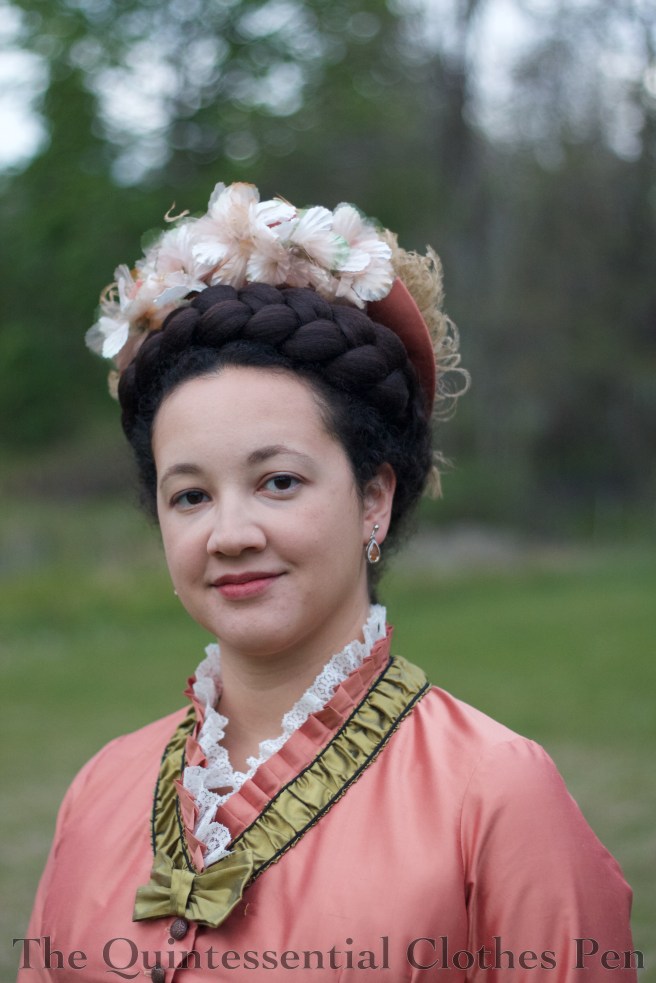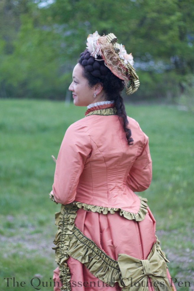 Looking at the years right around 1875 (the year of my reception dress), I found hairstyles with lots of curls and twists hanging down. 1875 is the part of the decade when the fashionable silhouette of dresses changes from the very round styles of 1870-1874 (like this, for example, from 1870) to the styles from 1875-1877 that have fabric starting to slide down the backs of skirts (like this, for example, from 1875).