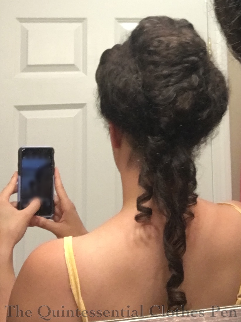 Below the loopy/swoopy bit I left curls hanging down at a few different lengths, as I saw in many fashion plates. This part turned out well!
