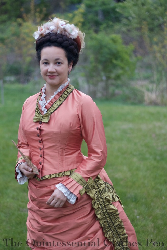 Recently, I’ve been hinting about my new 1875 reception dress. We’ve looked at the hat that I made to accompany it as well as how the hat was made. Now, I’d like to share focused details about the construction of the bodice of the dress.