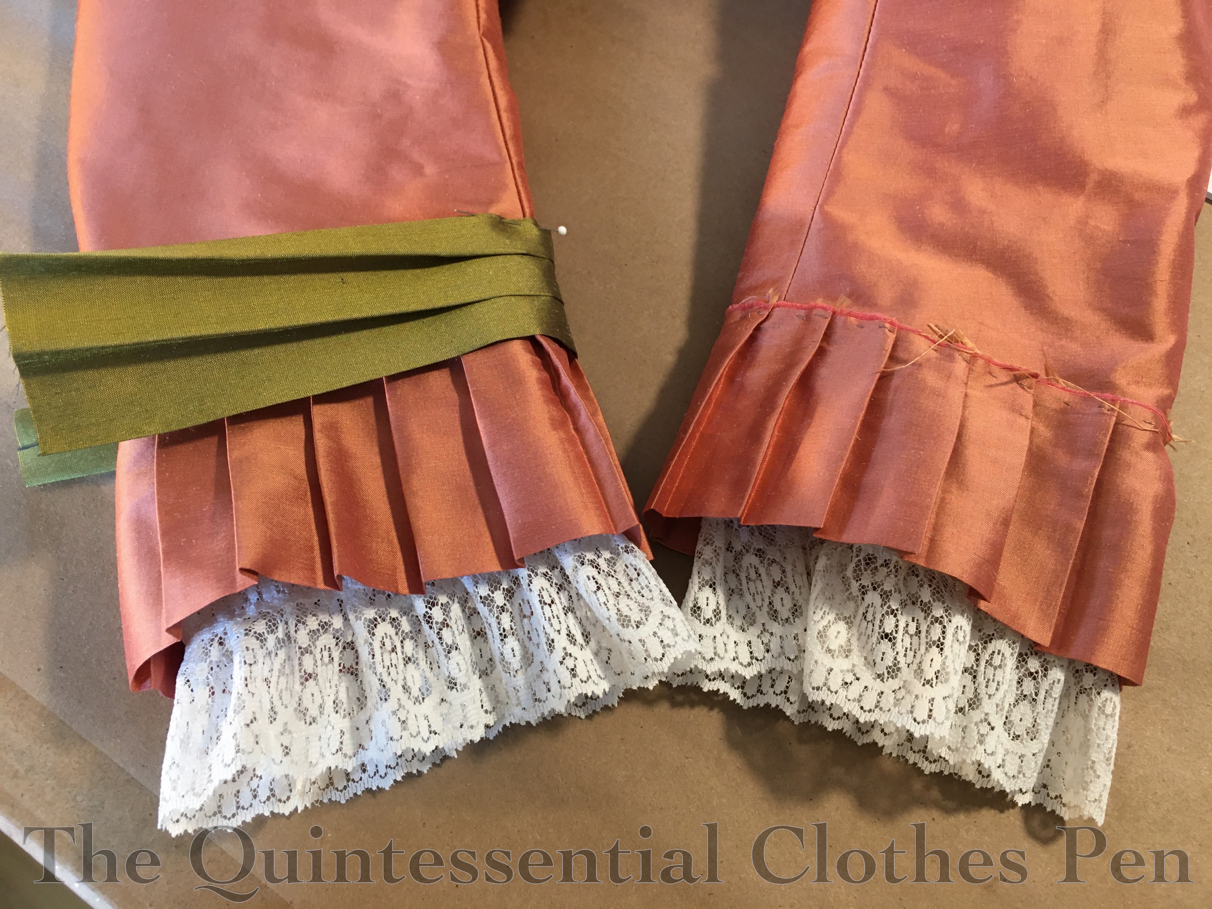 I started by cutting them off at a length that made sense with the addition of the pleats and hemming them. The pleats are pressed in the center so that no hemming is needed and the top edges are left raw. These raw edges are then covered by the green pleated bands. The lace is actually two rows of lace (to make the lace twice as wide) that are gathered and then sewn into sleeves. The final step that you can’t see here is a green bow to finish off the back sleeve seam area. The bow covers the raw edges of the green pleated band.