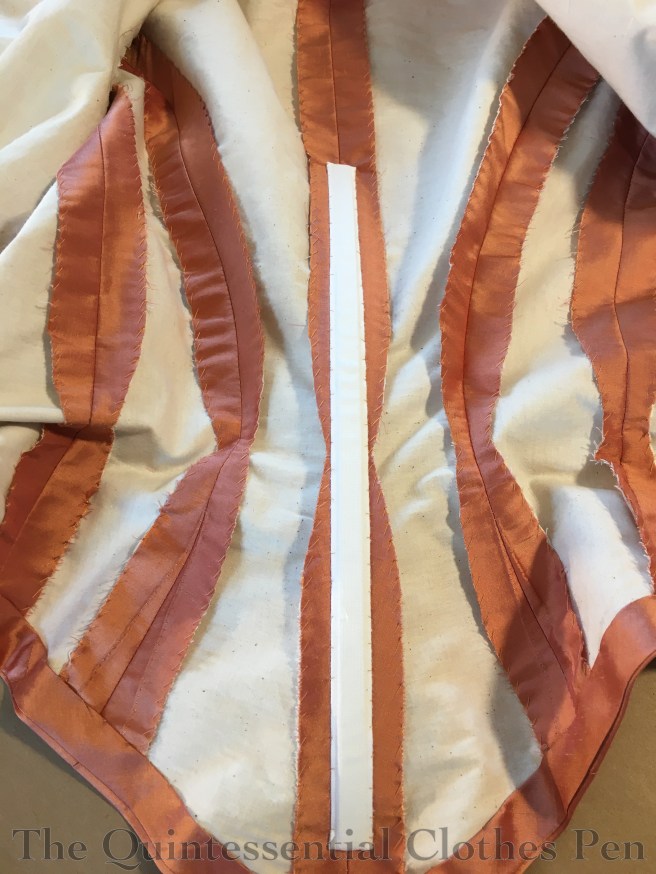 The bodice pieces of silk are flat lined with muslin. The seam allowances are whip stitched to keep them tidy. The bottom edge of the bodice is finished with self bias. The bodice is boned–at the point of this photo only the center back seam has a bone stitched in.
