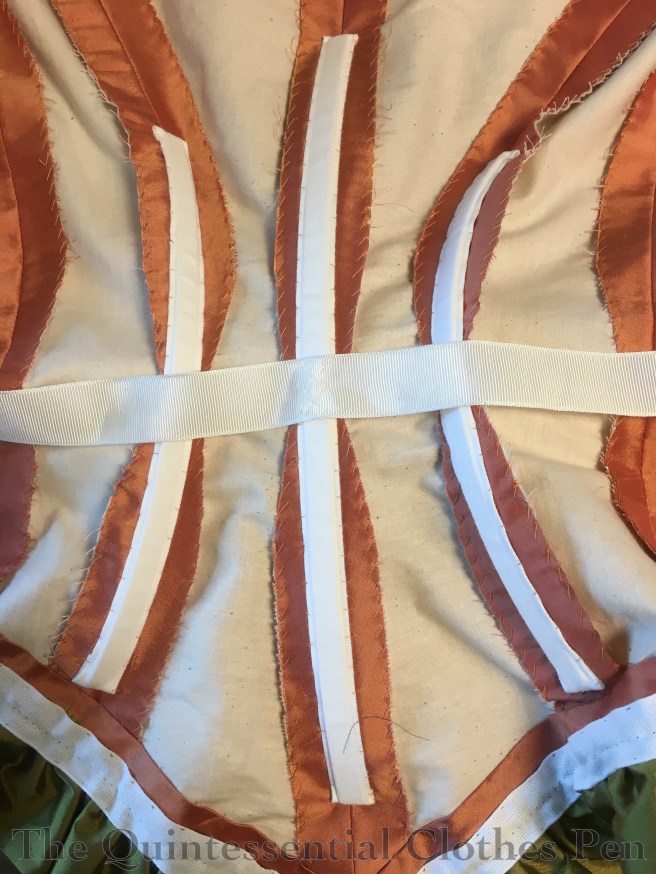 Here’s another view of the inside of the bodice that shows the green ruffle a little bit more. It also shows the bones on the side seams and a hint of the lace around the neck opening, the edge of which is also covered with ribbon–in this case, petersham. I found the lace too scratchy against my neck on it’s own, even though it feels relatively soft against my hand.