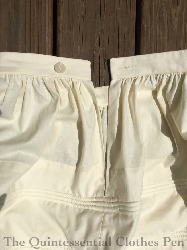 My opening is just a portion of one seam left open just above the top section of cording. This is what it looks like from the outside. I made the waistband extra long to allow for future adjustment (just in case!), which is why the button is set over so far from the edge of the waistband.