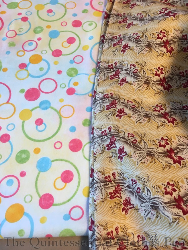 The fullness of the skirt is cartridge pleated to the waistband. I find that this quantity of cotton is weeny looking when cartridge pleated to a waistband without a little help to create loft, so I sandwiched a single layer of cotton flannel into the pleats to help them have a little bit of puff. I just used scrap flannel from my stash for this–the fun dot print pictured below. This is the top of my skirt pressed and ready for pleating!